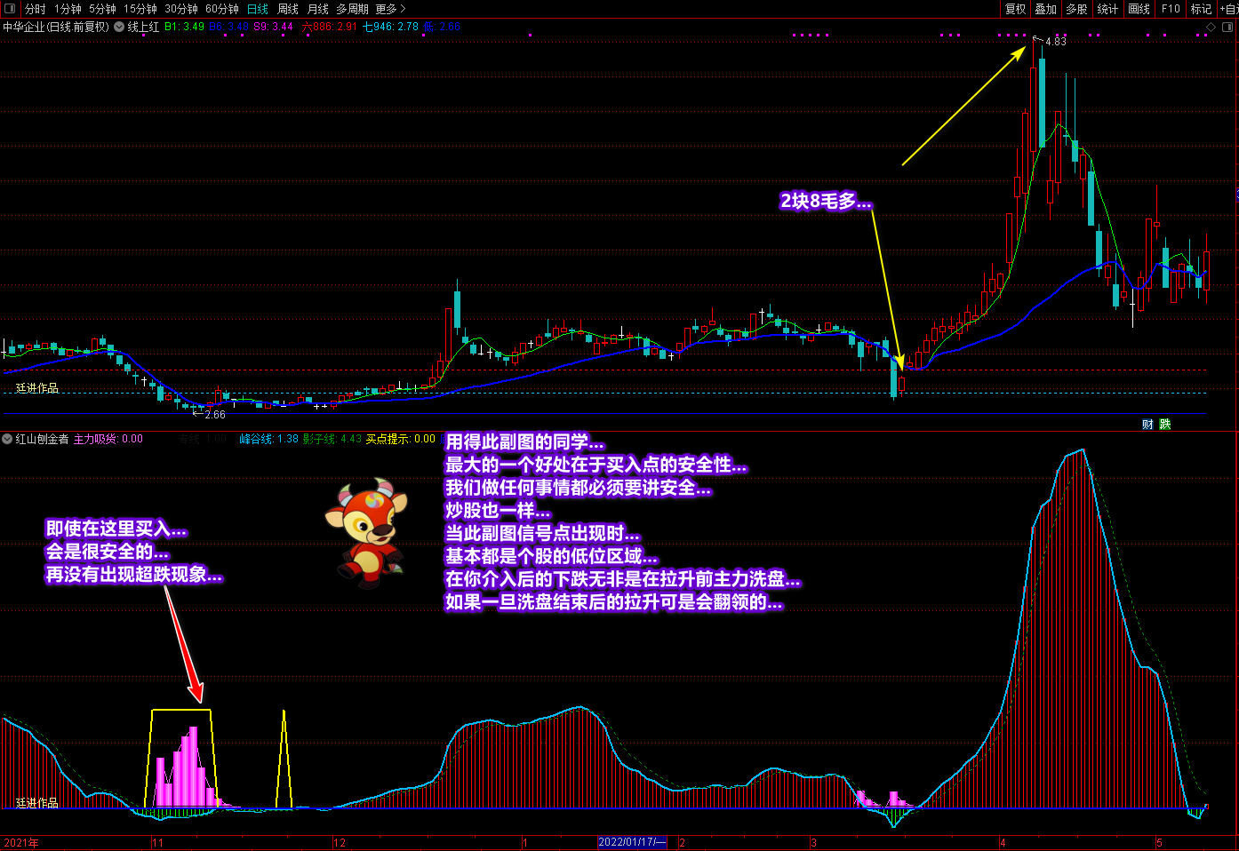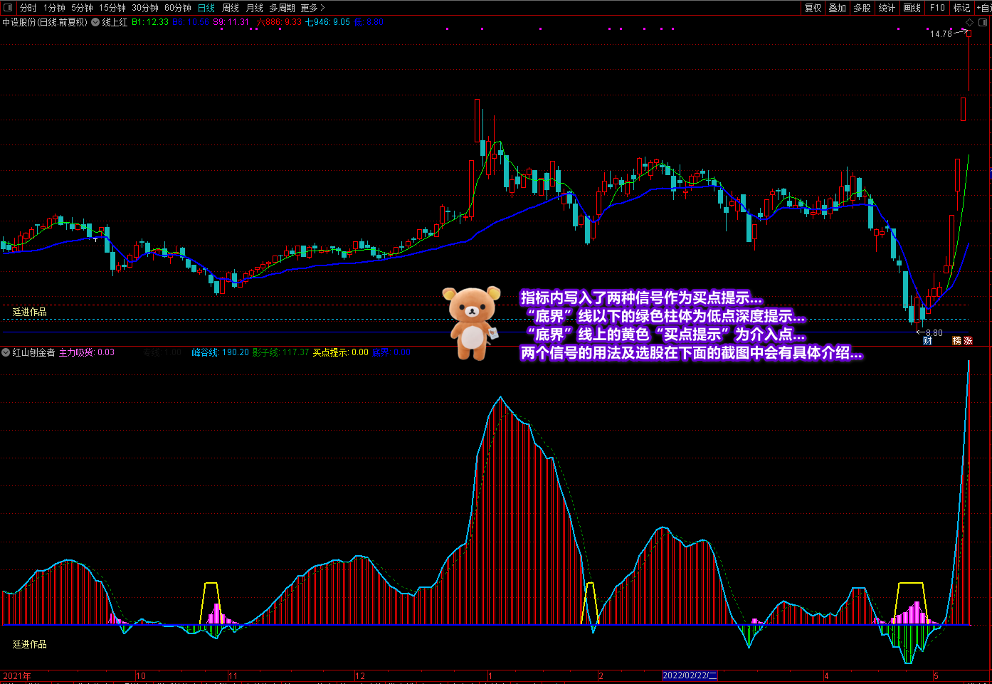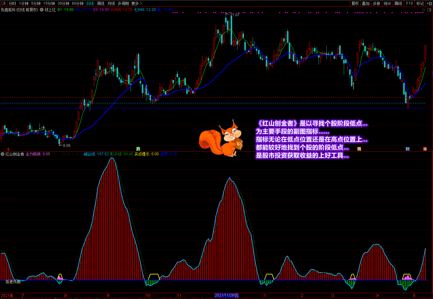 《红山刨金者》副图是最近在新疆作业时写的一个阶段底部买入指标,经过测试与优化实战效果很不错。指标的操作要领和说明都在截图中作了较详细的讲解,这里不再复述。