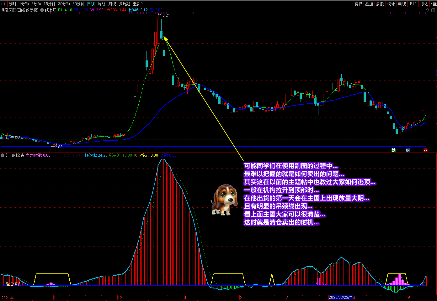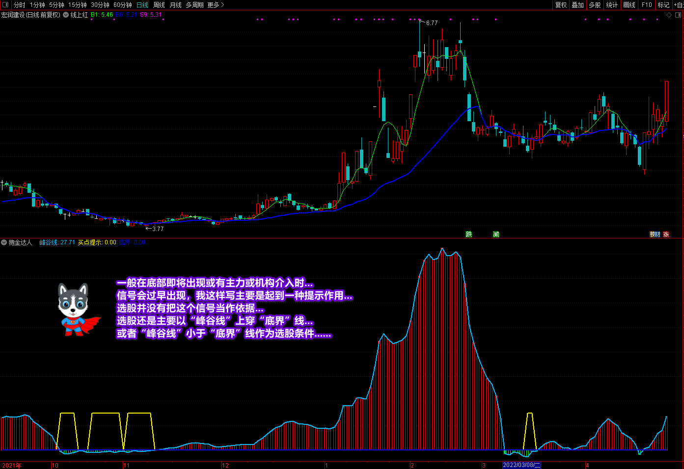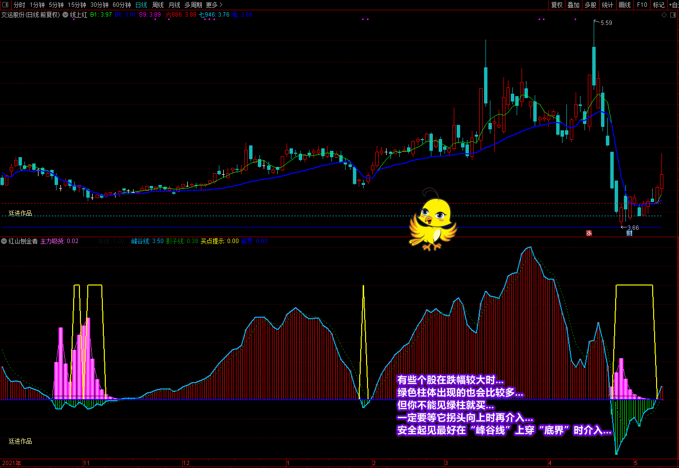 《红山刨金者》副图是最近在新疆作业时写的一个阶段底部买入指标,经过测试与优化实战效果很不错。指标的操作要领和说明都在截图中作了较详细的讲解,这里不再复述。