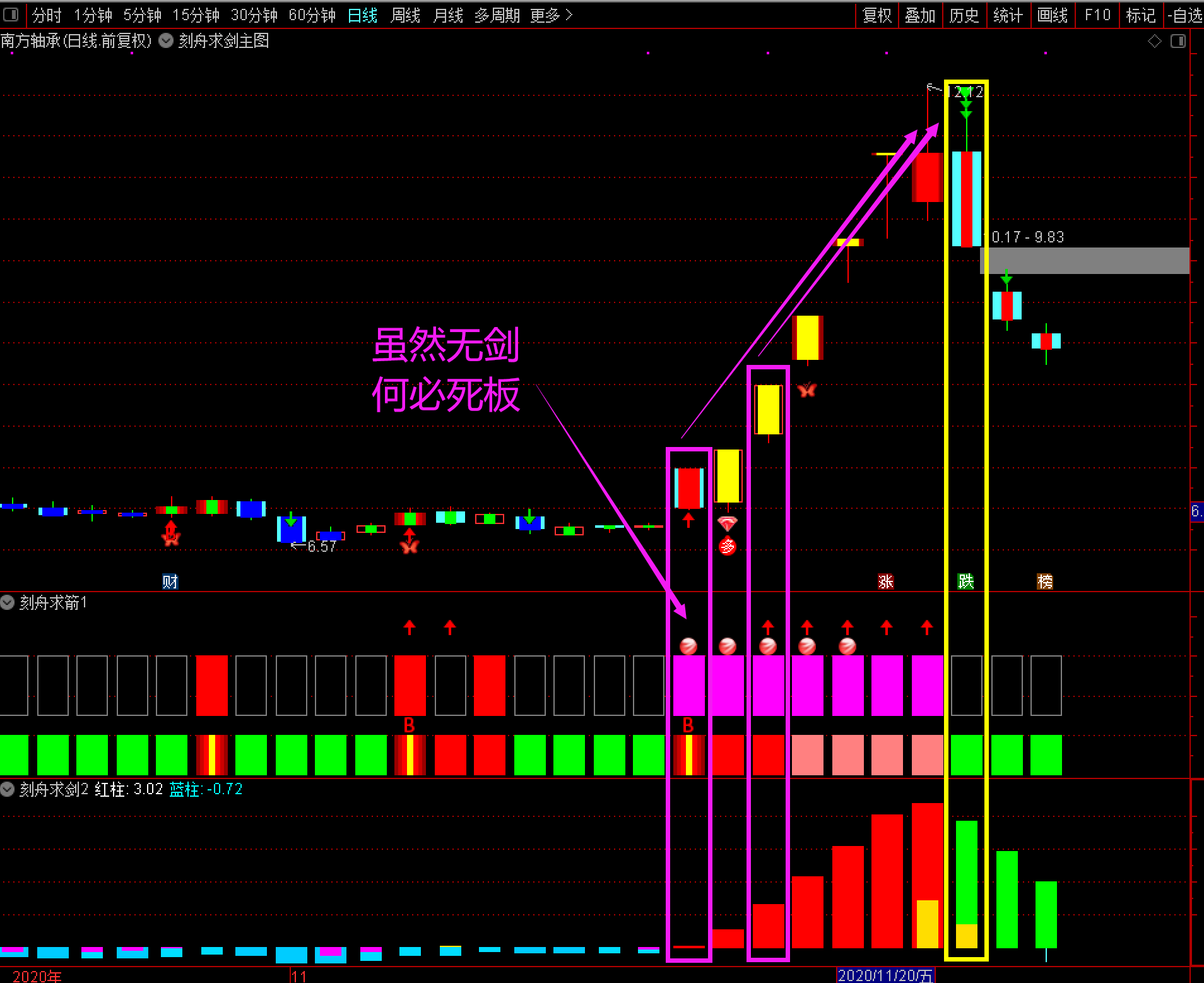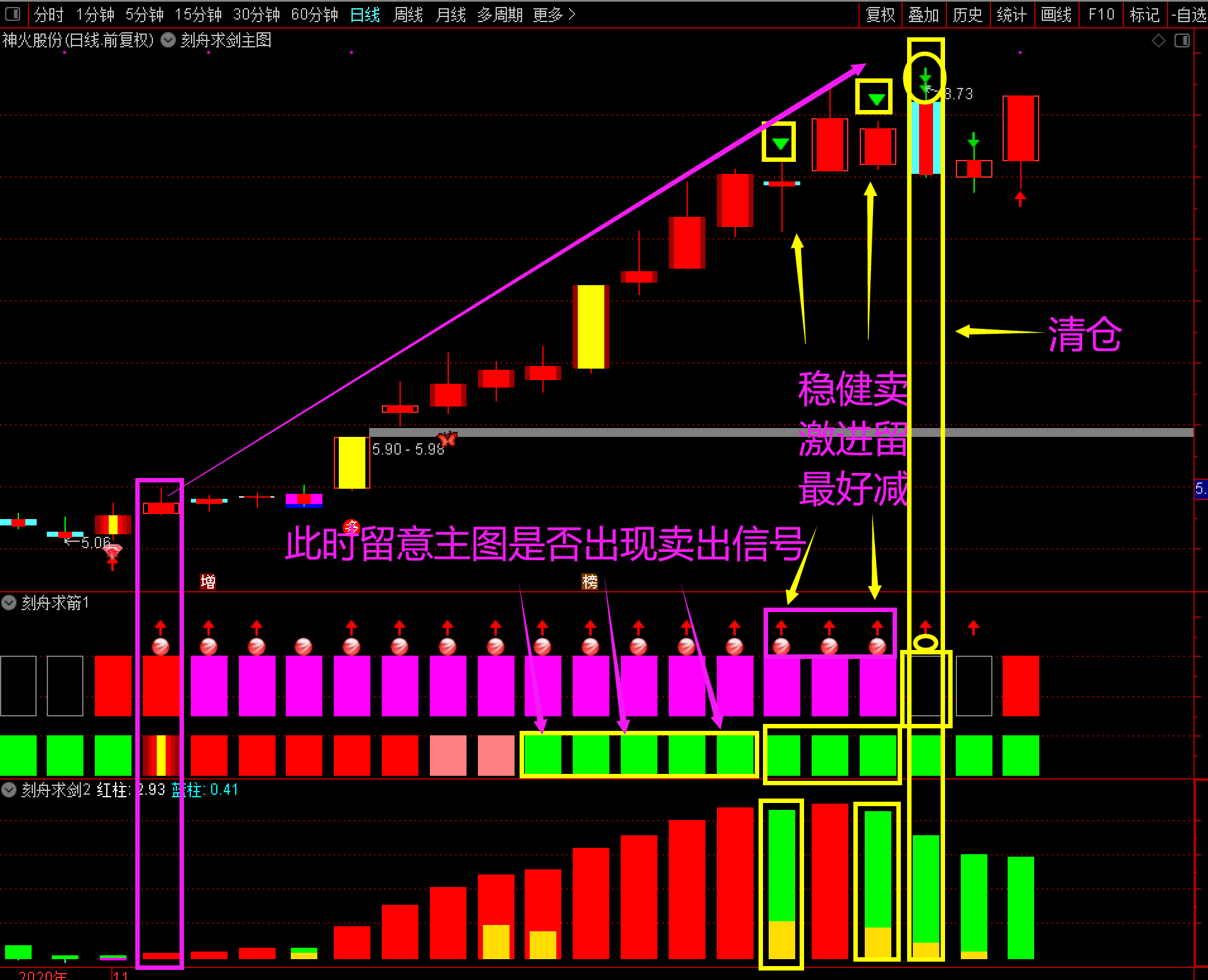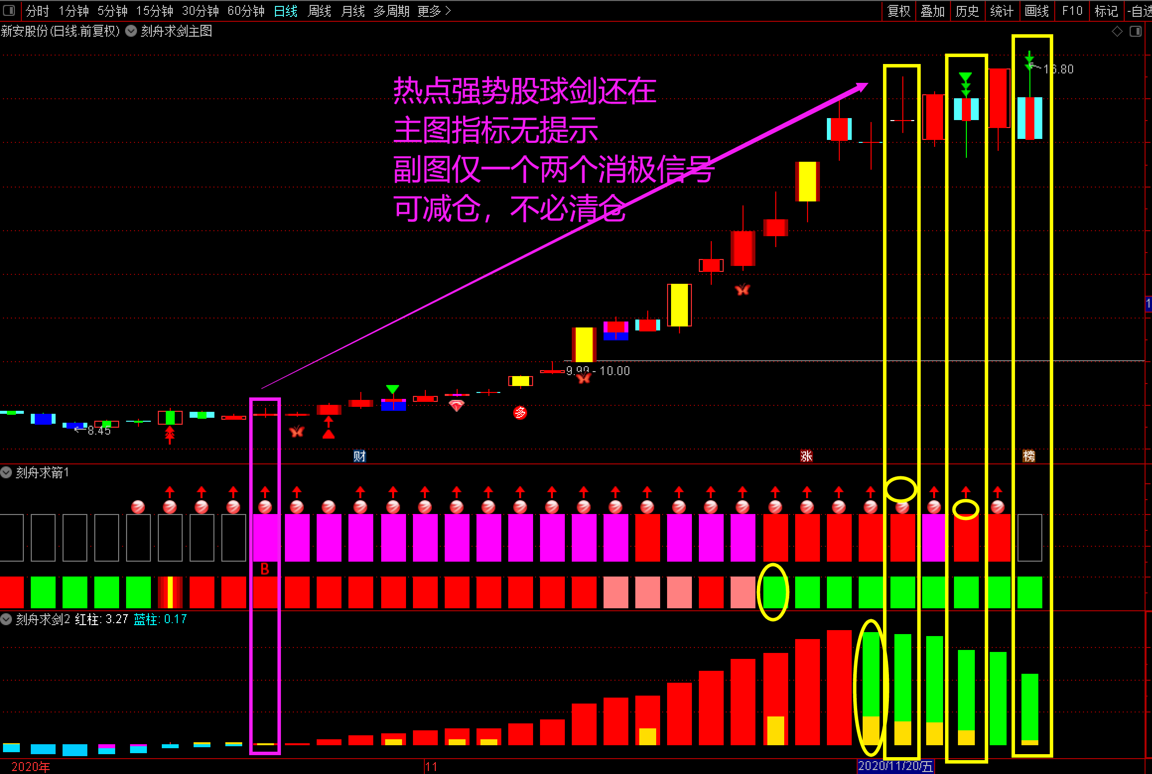 在副图方块全红(舟)的前提条件下:箭头+红球(剑),买入;方块变绿或者箭头和红球任意消失一个,卖出。其它激进操作可自己决定。
