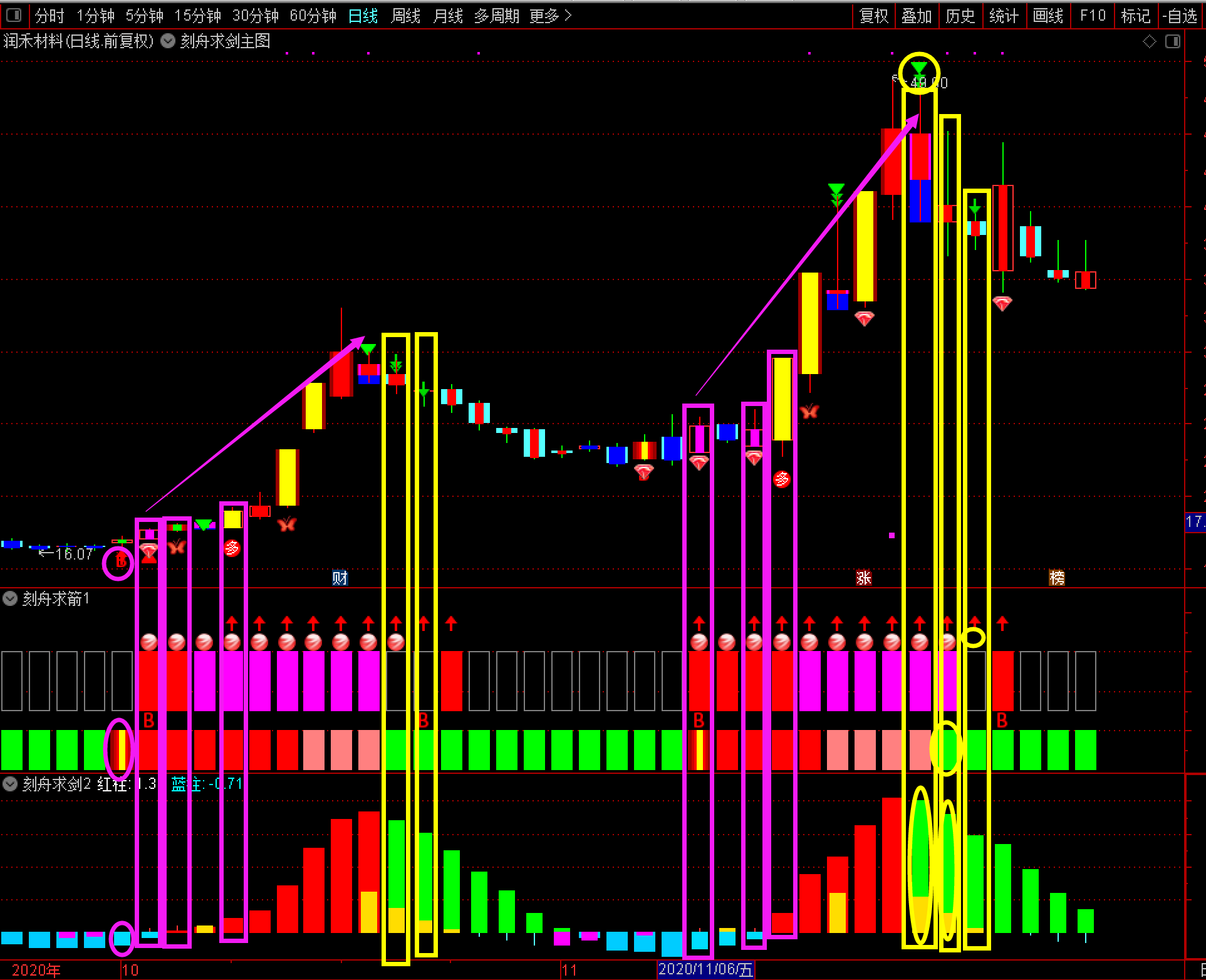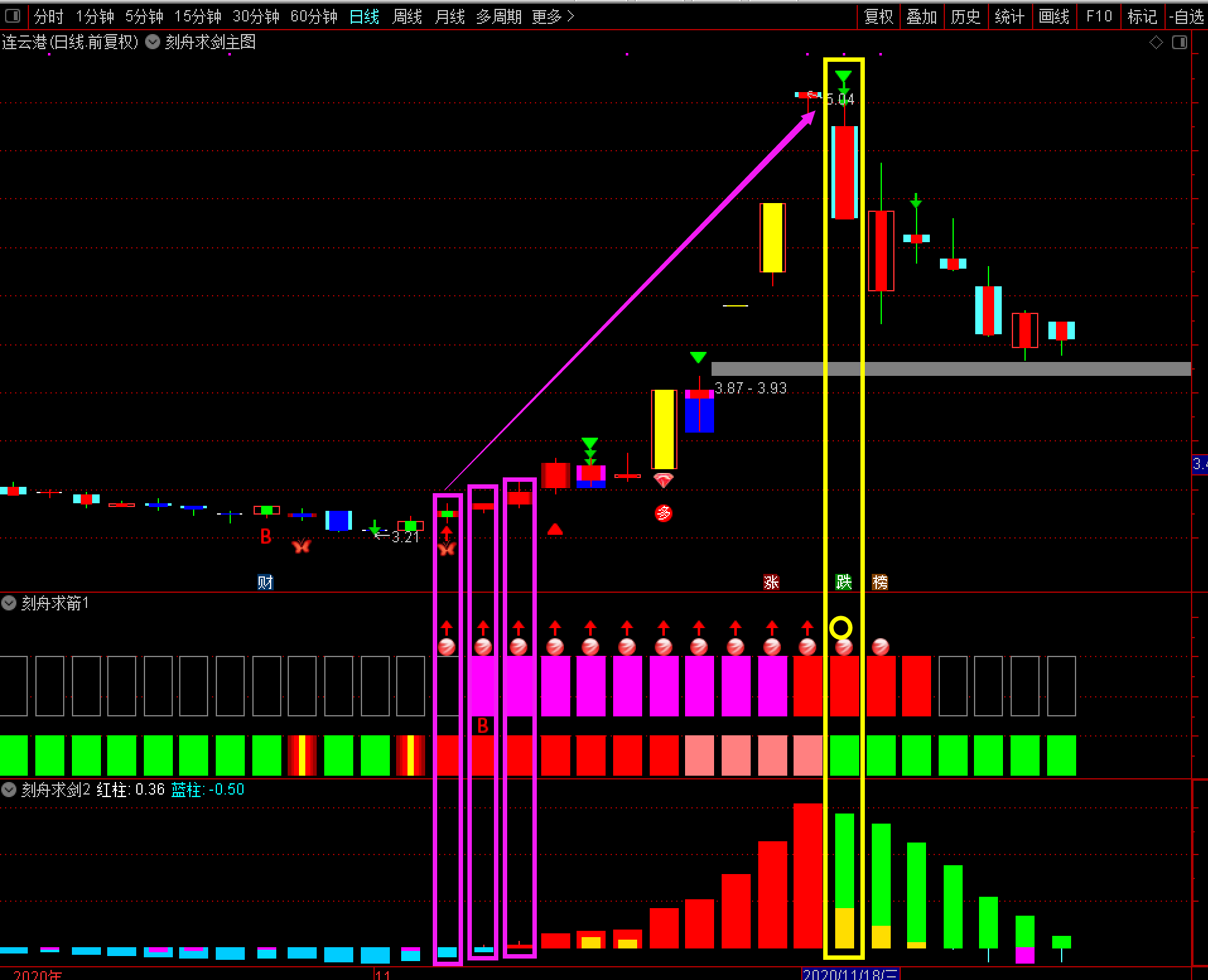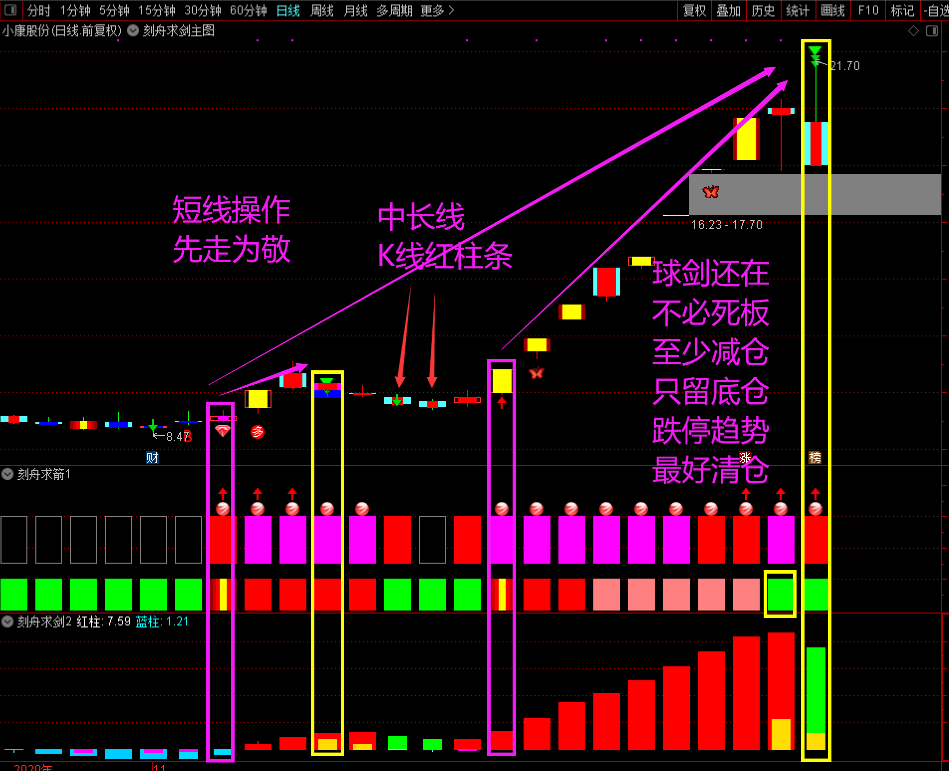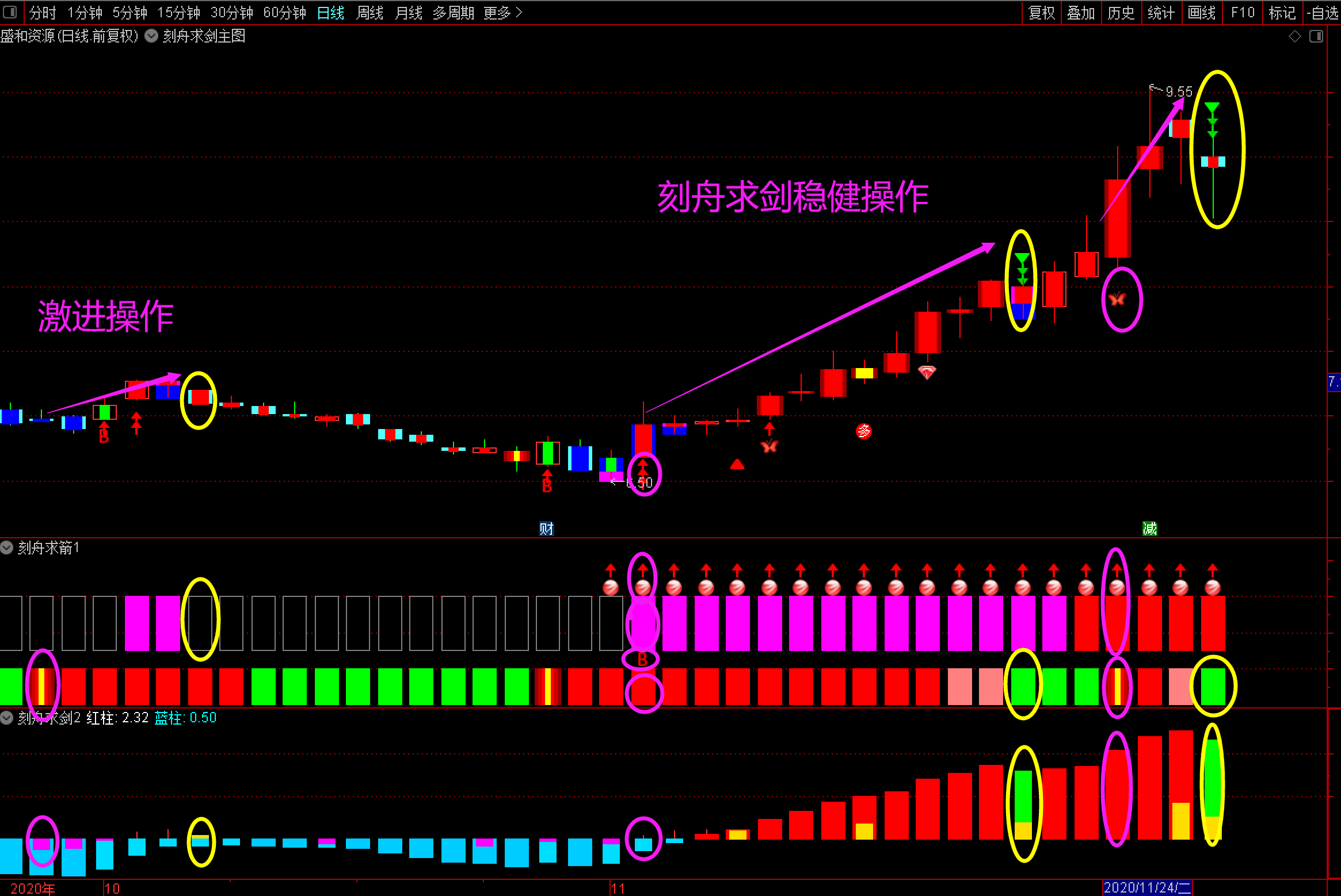 在副图方块全红(舟)的前提条件下:箭头+红球(剑),买入;方块变绿或者箭头和红球任意消失一个,卖出。其它激进操作可自己决定。