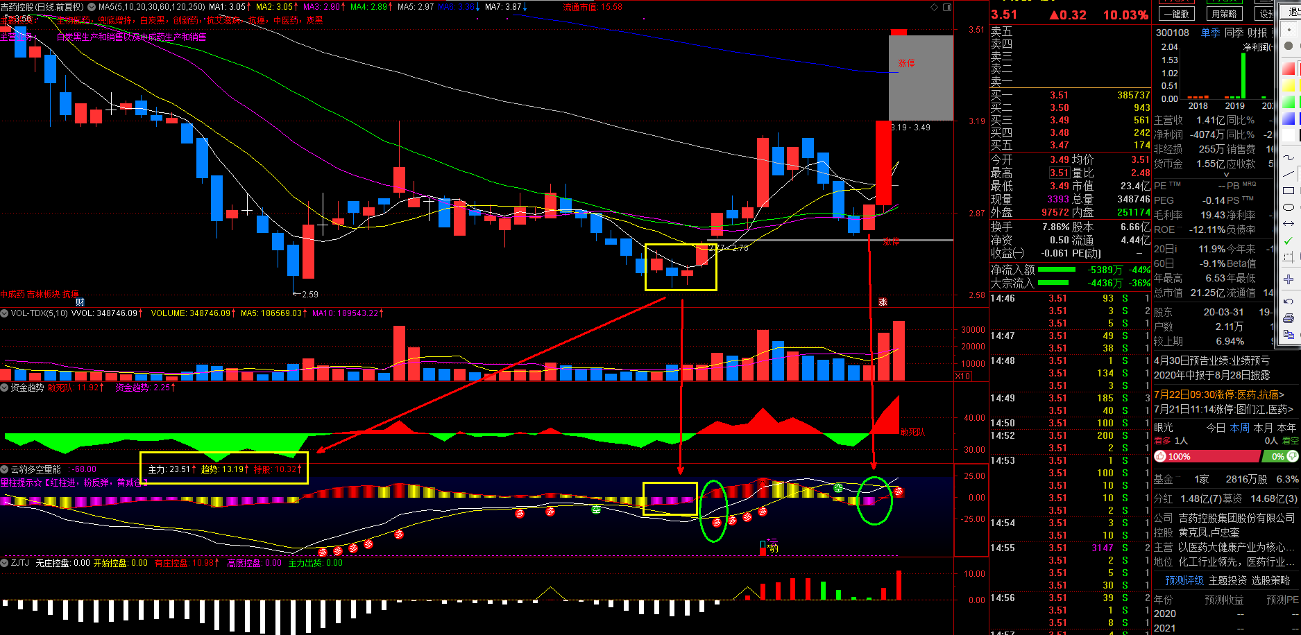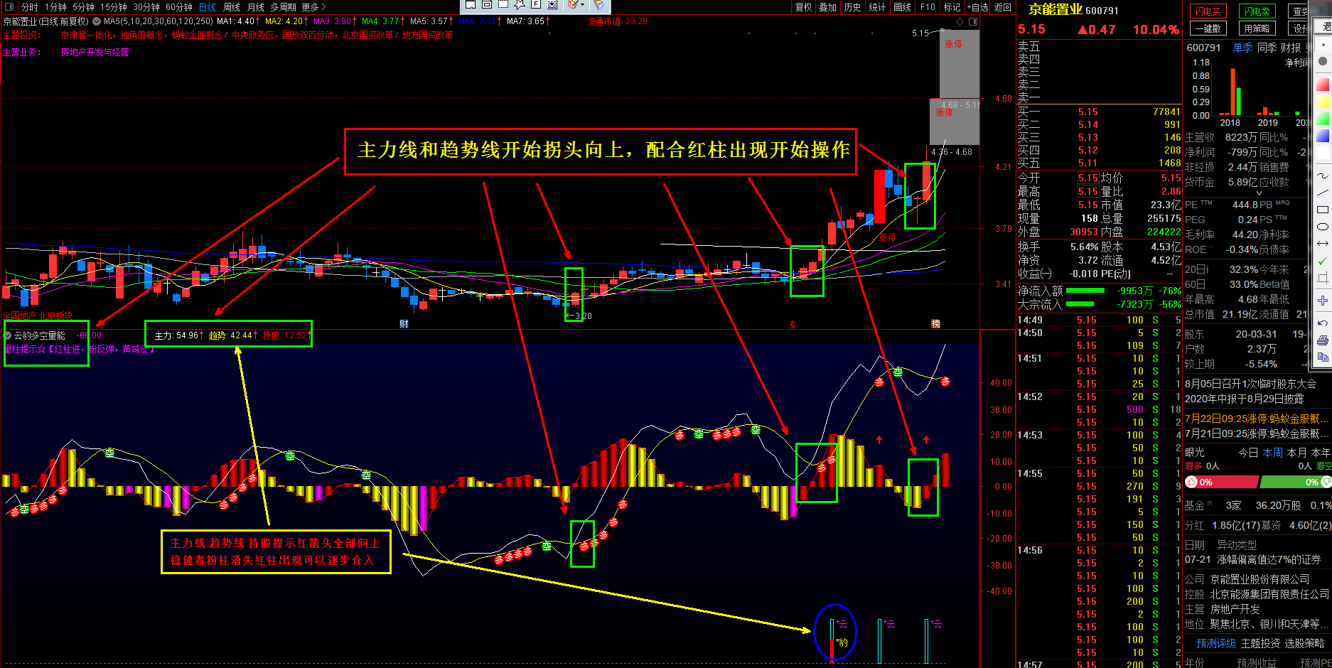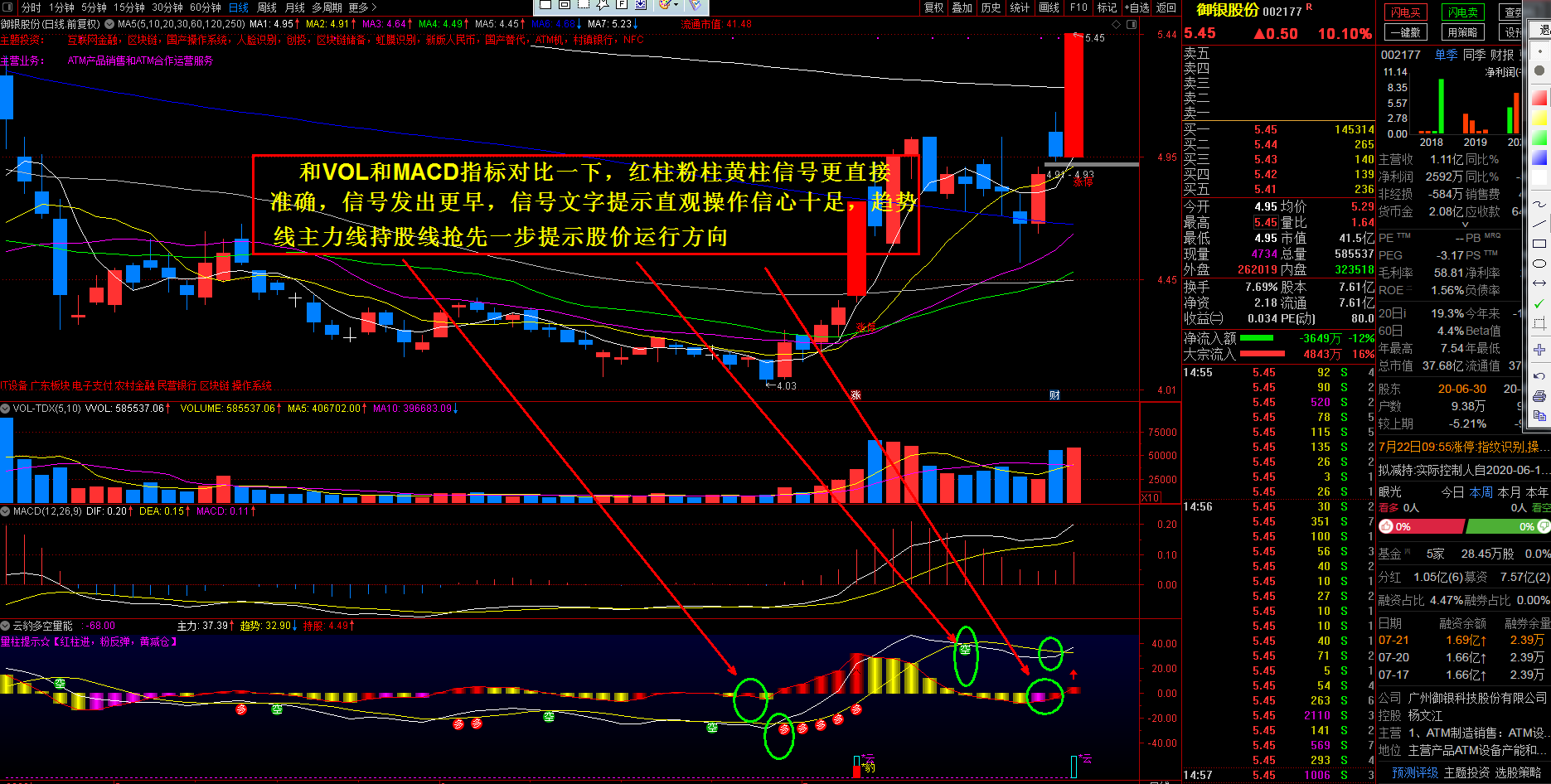 信号效果更佳,主力线和趋势线拐头向上并发出红箭头提示高度关注,副图持股线提示配合红箭头发出确定上涨趋势。