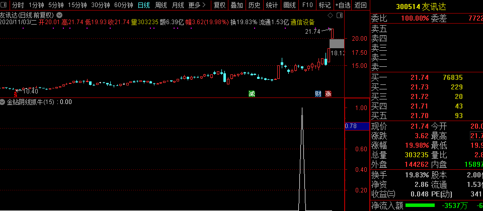 这个指标是通达信的指标,只能在通达信软件上使用!有没有信号以当天收盘价为准!可以在收盘前几分钟介入!