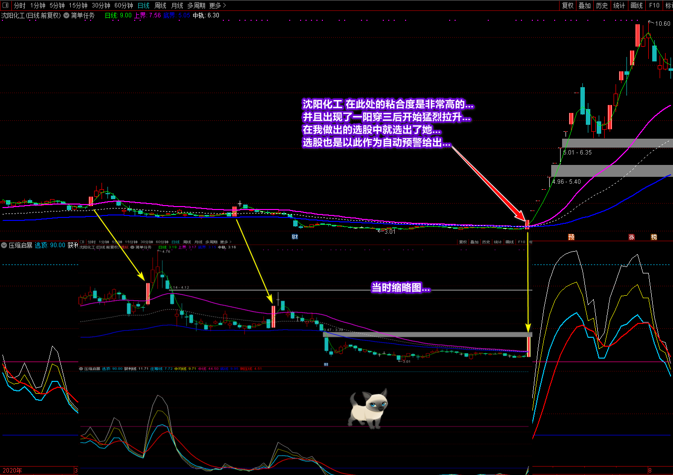 “一阳穿三”有两种表示方法;一种是一根阳K柱同日上穿了设定的三根均线,还有一种是一根设定的均线同日上穿了另外三根均线。这两种上穿不是固定的MA均线,可以由指数编写者设定。所以说这里的“一阳穿三”是不能用在MA均线上的,是专门针对《简单任务》而设计编写的。因为在《简单任务》指标中,三线的粘合程度没有固定值可寻,粘合时的距离有大有小甚至出现负粘合,所以没有一个指标可以把你看似粘合的个股选出来,只有通过一阳穿三的方式来找出三线相近或粘合的个股来。通过多次观察试用,大凡用这种“一阳穿三”的方式选出的个股,都是接近三线粘合形态的,但也会出现因阳柱太长太大,把一些三线距离较大的个股选 了出现,但你可以按我在1楼指标截图说明中的方法来加以甄别,选到符合条件和真正粘合接近的个股来。指标是死的,人是活的,只要你努力,相信你会抓得好,有实际效果。