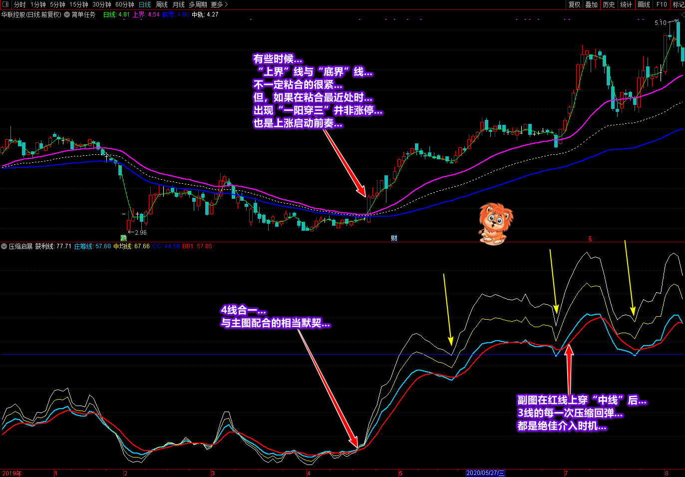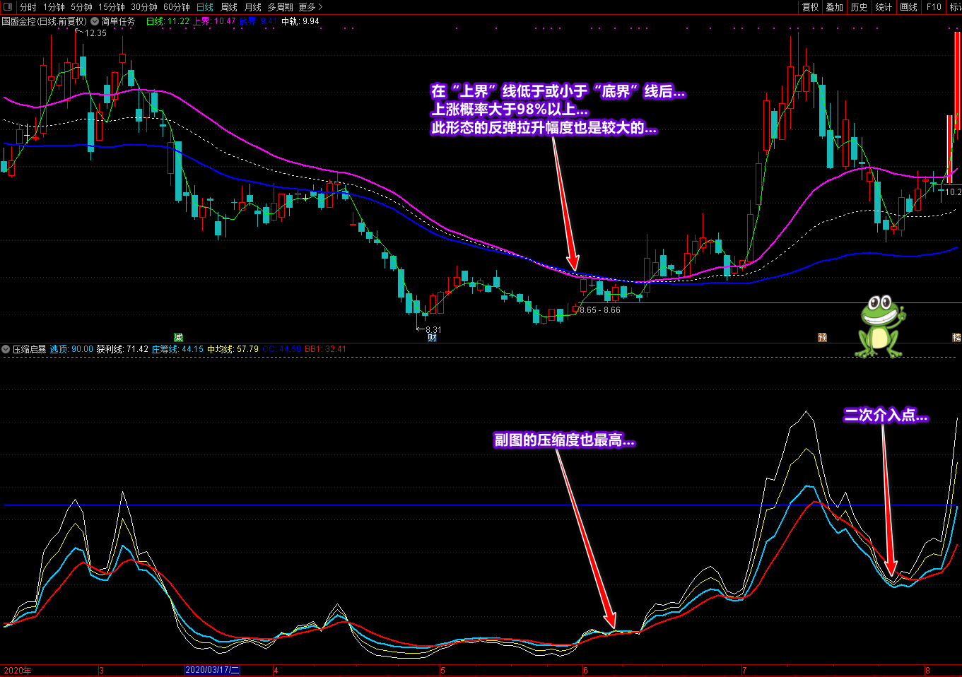 一定要多看股票,多练习,多比较。特别是对于当日涨停的股票,每天再看一遍。有时候,你不必选择。每天只要看到涨停股中有类似或者符合选股两个条件的股票,就可以放到股票池中观察跟踪。在她回调洗盘结束后,绿色“日线”上了“上界”线后就可以介入了。还有一个一定要耐住性子,不要着急,有时在出现形态后,庄家是有一个洗盘动作的,性子太急会把你洗掉的,慢慢摸索你会有提高的!