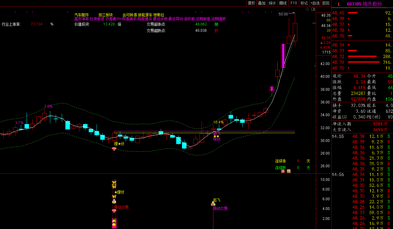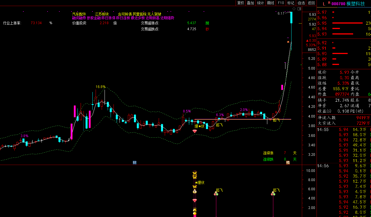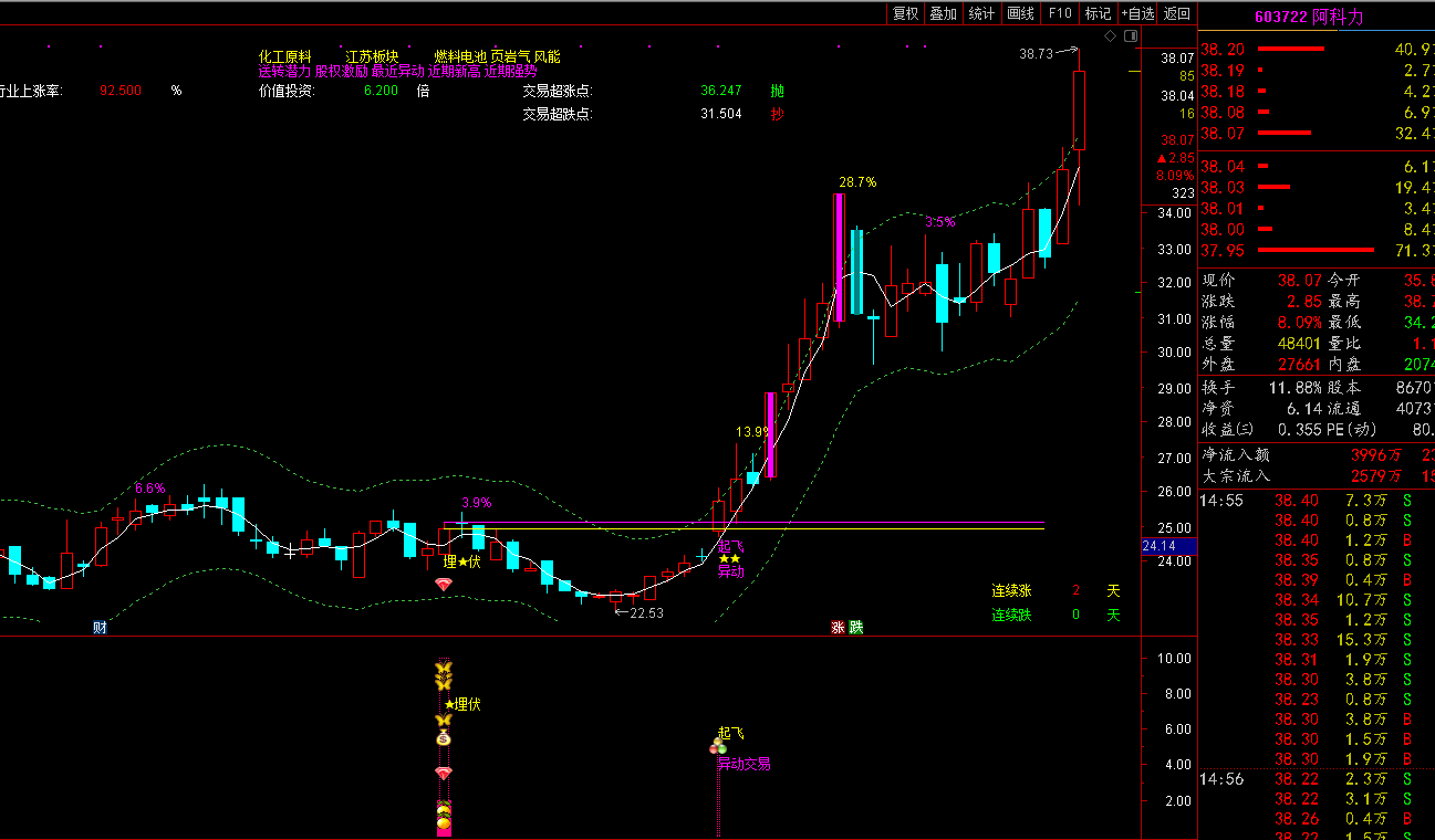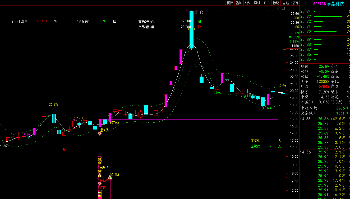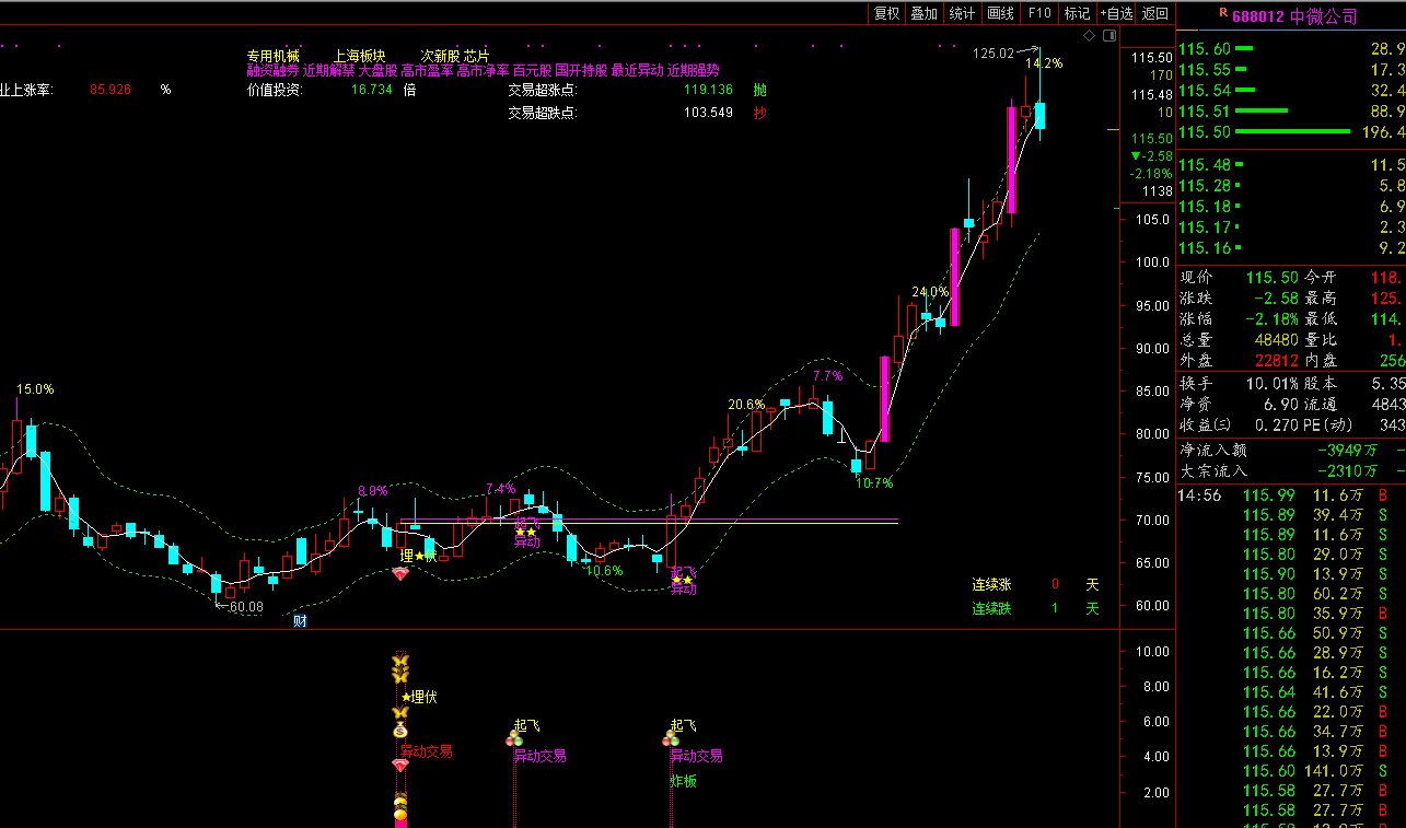 只要是指标都是这样的,不管什么指标都是一样的,因为盘中交易的信号有时候是不稳定的,会有一定的概率情况会消失,所以像这种情况如是要在当天操作的朋友又想保存信号 存在,可以在临近收盘的时候操作,所以基本上收盘的时候信号都是可用的,只要是无未来函数的指标。以后不管个股怎么运行,信号都是一直存在的。