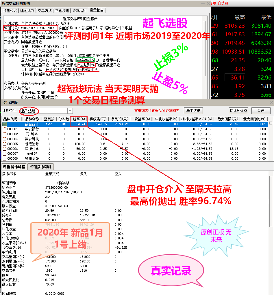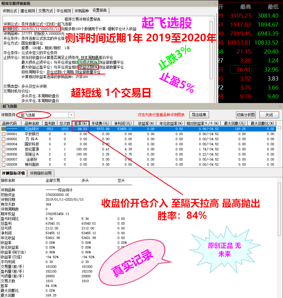 这样算有点算不准 因为如果按持仓5天来算 止损3个点 收益10% 胜率73.9% 所以一般指标 我们开发时一般都是保证在超短线1天交易日的胜算达到最高 保证出手的概率要高 至个股后面能涨到多少 毕竟后面变动性太大 跟个方面原因有关 程序算就算不准了。