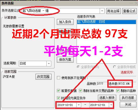功能原理:此埋伏起飞组合是对符合操作的个股进行提前埋伏潜藏提示,等到主力真正要开始非正常拉伸的时刻,符合要求的个股会在主力开始的第一天捕捉到信号提示进行快速择时。