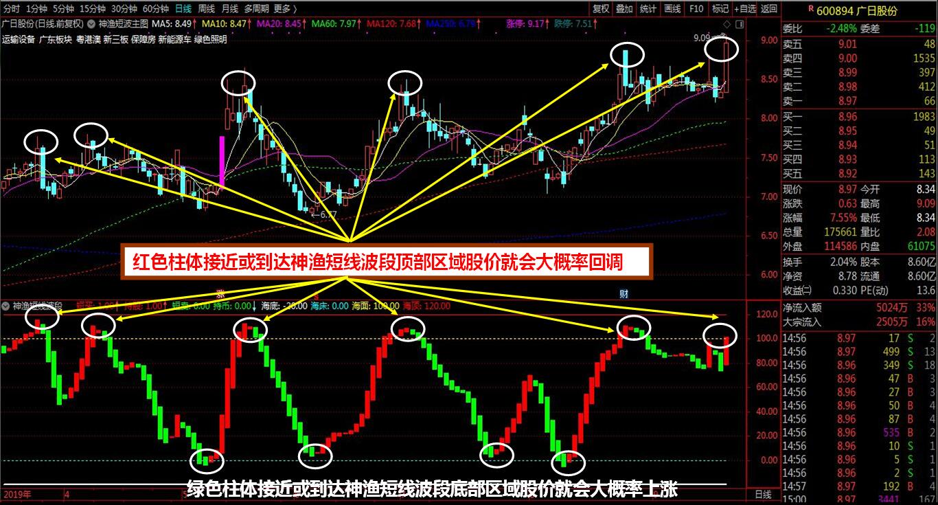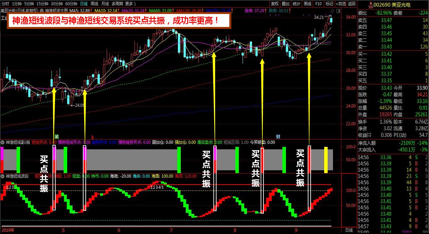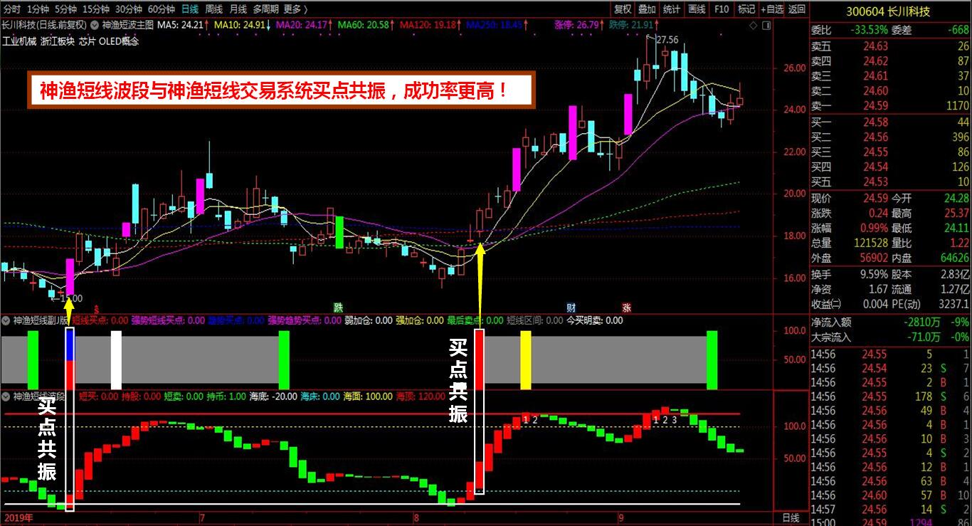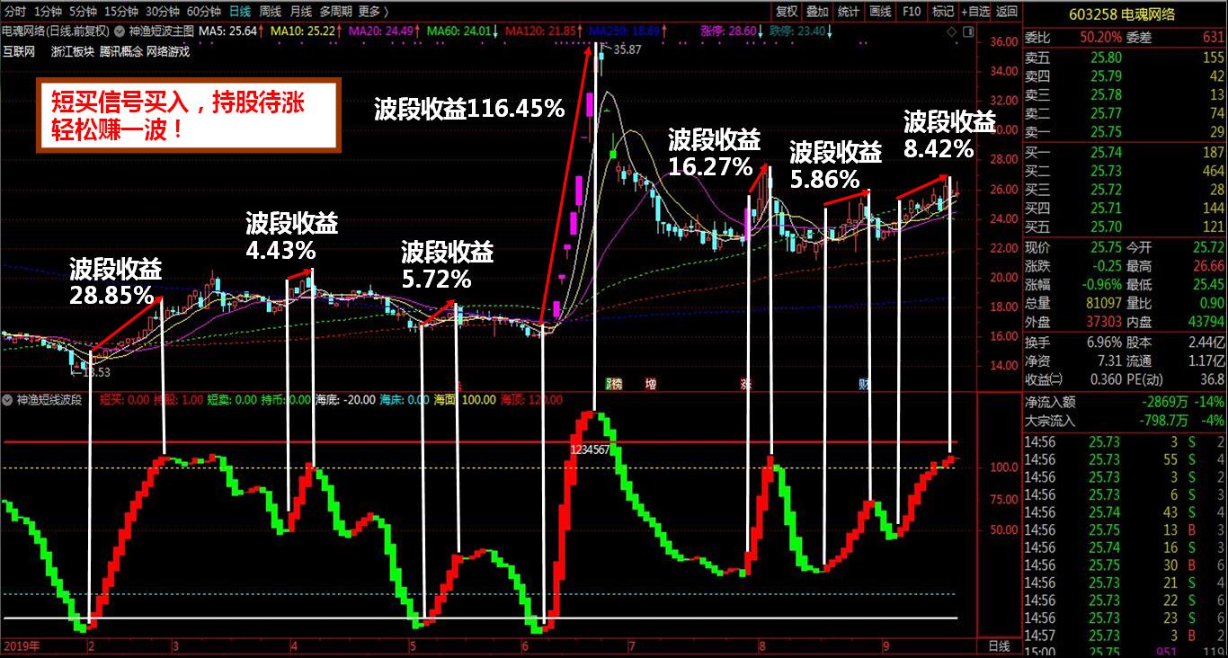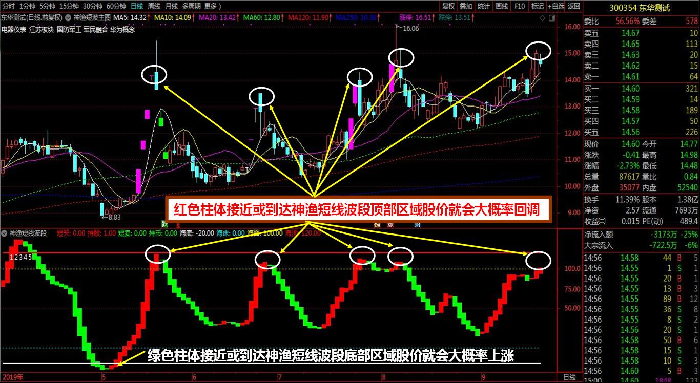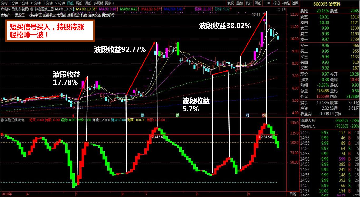 神渔短线波段----糅合买卖点提示+波段操作+判断顶底位置趋势+短线买点共振四大功能于一体,是一个真正能辅助投资者短线交易,帮助朋友实现轻松稳定盈利梦想的决策指标!短期波段滚动操作是必须的!