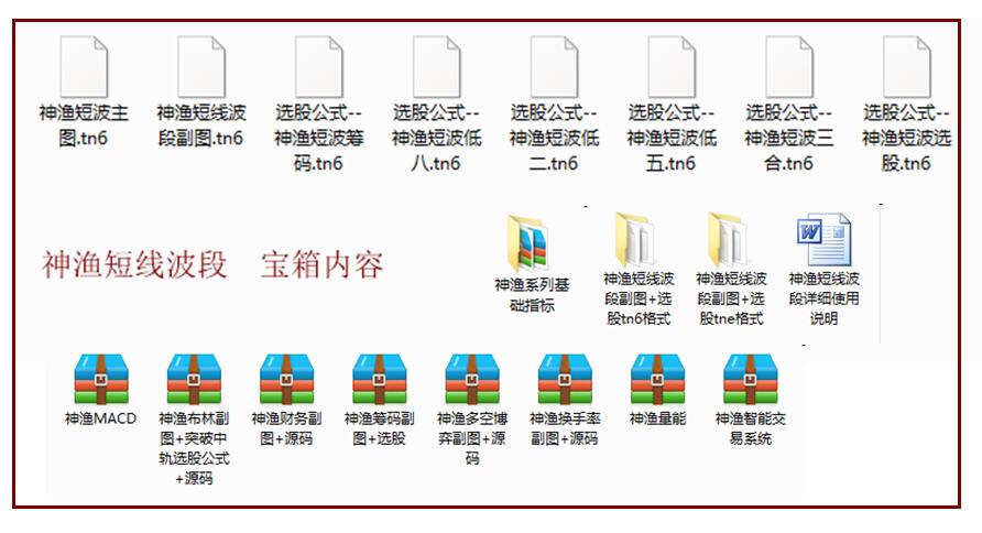 3、本指标含有1个副图和6个选股指标公式(全部完全加密),并配套有一个详细使用说明(10页,内含神渔的实盘经验体会),并额外赠送1个神渔短波主图。