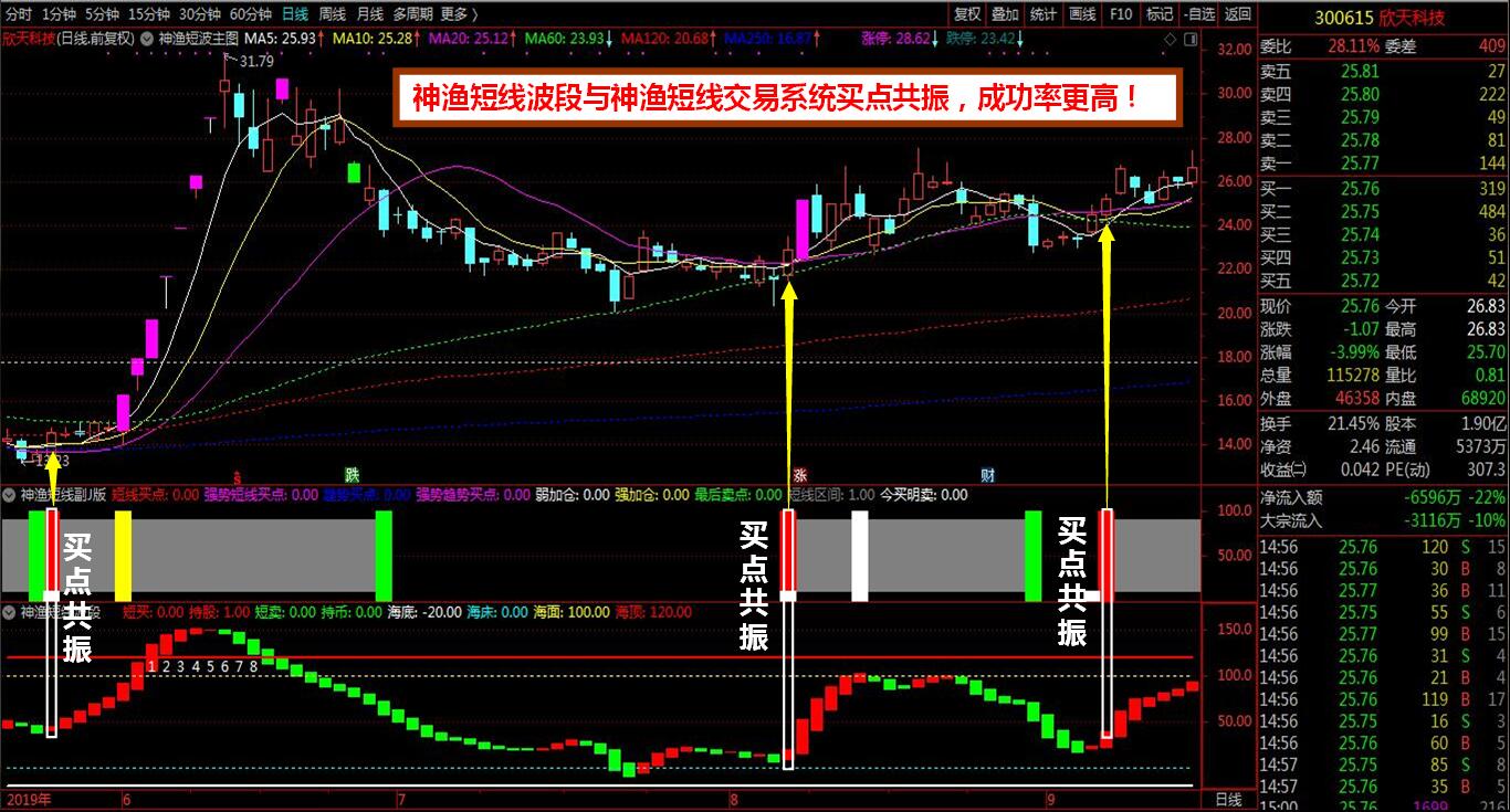 3、辅助神渔短线交易系统决策。非常协调的和神渔短线买点、短线区间共振,共振买点成功率更高;本指标的卖点比神渔短线卖点提前,帮您锁住更多利润!
