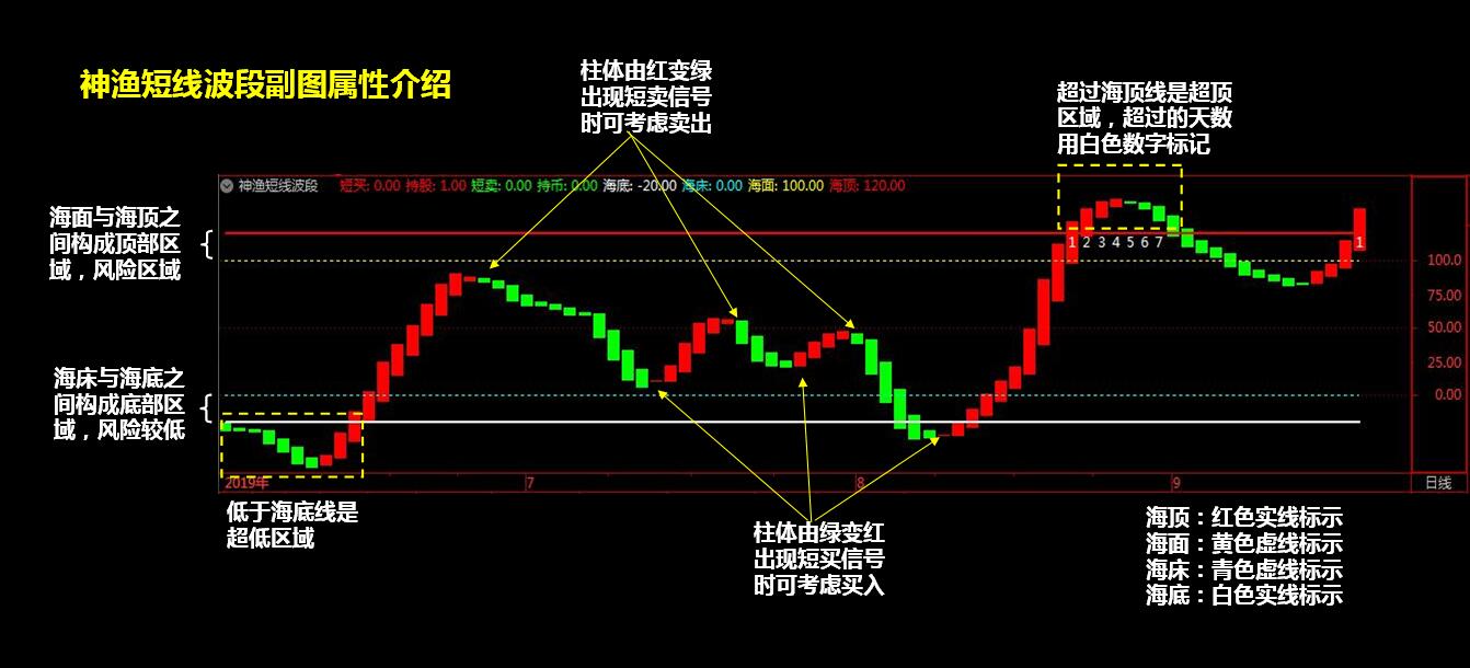 5、海底、海床、海面、海顶:判断股价处于顶底位置的参照线。海顶:红色实线标示海面:黄色虚线标示海床:青色虚线标示海底:白色实线标示。海底和海床之间构成底部区域;处于海底之下是超低区域;海面和海顶之间构成顶部区域;超过海顶之上叫做超顶区域,超过的天数会用白色的数字依次标记出来。