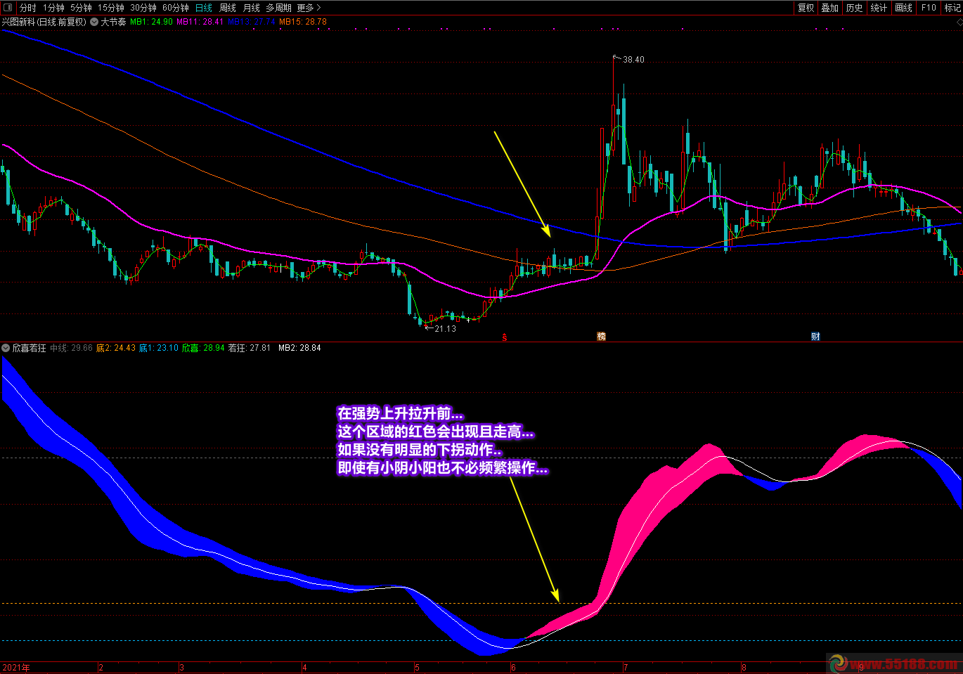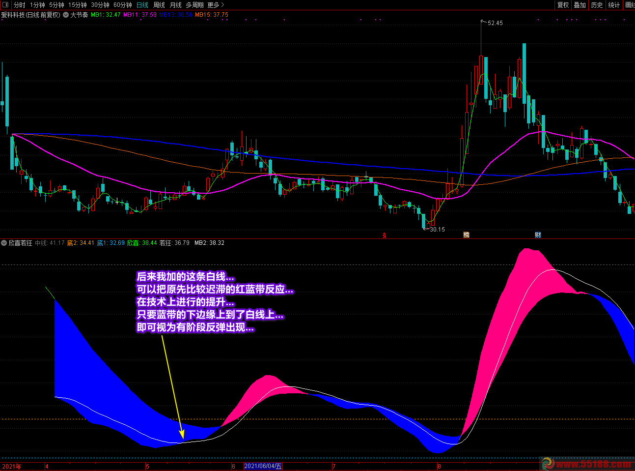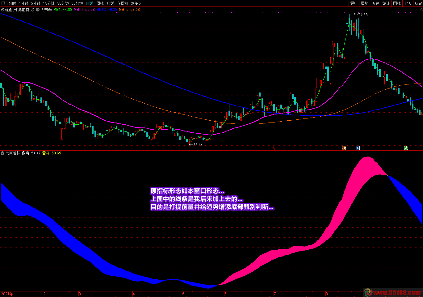 说清楚;指标不是我写的,是一个在《今日头条》做自媒体讲座的老大哥给我发头条消息修改的。他说他六年前花了9000千元钱从一个网站老师那里买的。当时市场处于2015年的牛市,使用购得的《欣喜若狂》指标也赚到不少钱,后来2016年市场走坏之后,他就不能用这个指标了,每次都亏损。在《头条》中,他用视频方式讲解了《欣喜若狂》指标的失败过程,从他视频中看指标的形态还算不错,但通过他讲解指标的失败过程中提到了;当一个低位拐点出现红带后买入,过了几天红带消失了,又重新在一个低位拐点又出现了红带。通过这一点我判断他这指标中明显存在未来函数。