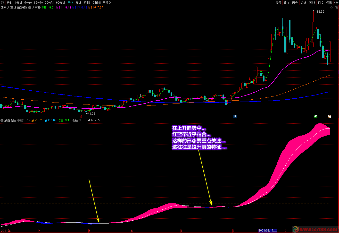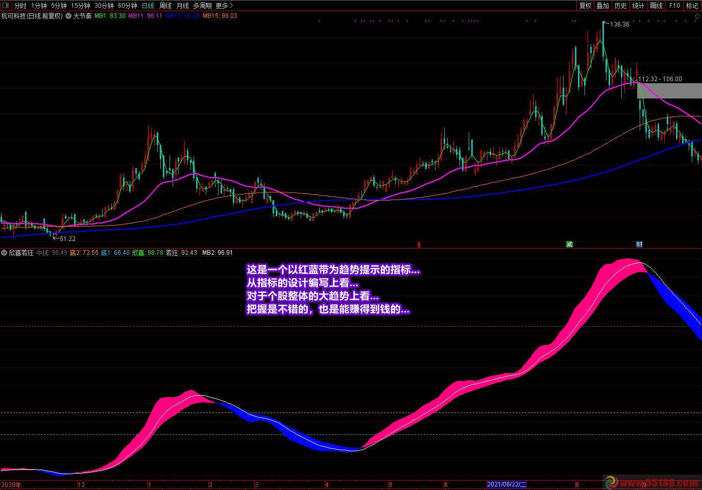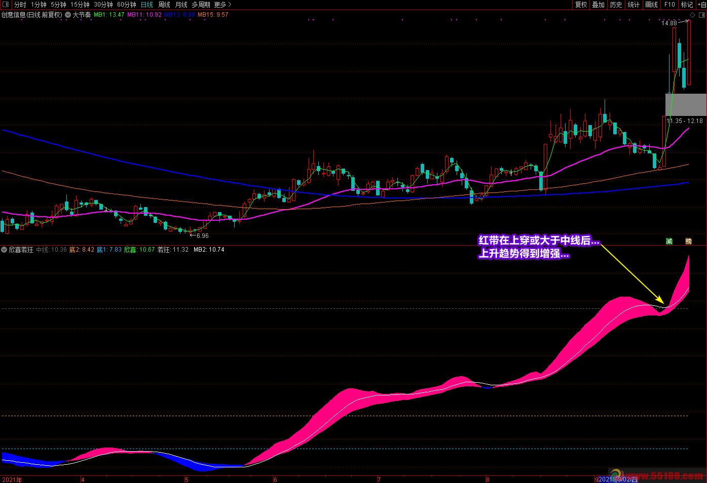 说清楚;指标不是我写的,是一个在《今日头条》做自媒体讲座的老大哥给我发头条消息修改的。他说他六年前花了9000千元钱从一个网站老师那里买的。当时市场处于2015年的牛市,使用购得的《欣喜若狂》指标也赚到不少钱,后来2016年市场走坏之后,他就不能用这个指标了,每次都亏损。在《头条》中,他用视频方式讲解了《欣喜若狂》指标的失败过程,从他视频中看指标的形态还算不错,但通过他讲解指标的失败过程中提到了;当一个低位拐点出现红带后买入,过了几天红带消失了,又重新在一个低位拐点又出现了红带。通过这一点我判断他这指标中明显存在未来函数。