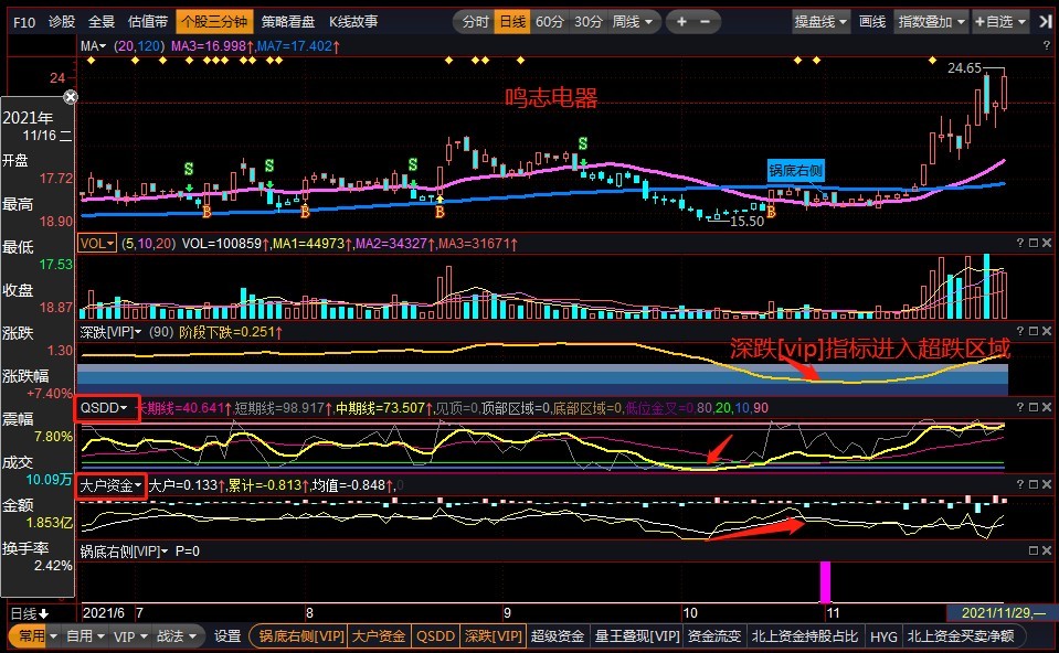 同样的,11月1日触发锅底右侧的鸣志电器(22.54,-3.51%,15.5)其后也出现了可观的波段行情,该股与上面的横店东磁(20.11,-4.24%,17)类似,其深度[VIP]指标进入超跌区域,QSDD指标有过短期线上穿中长期线的过程,代表主力资金的“大户资金”指标也在触发日前出现了一波持续的流入动作:
