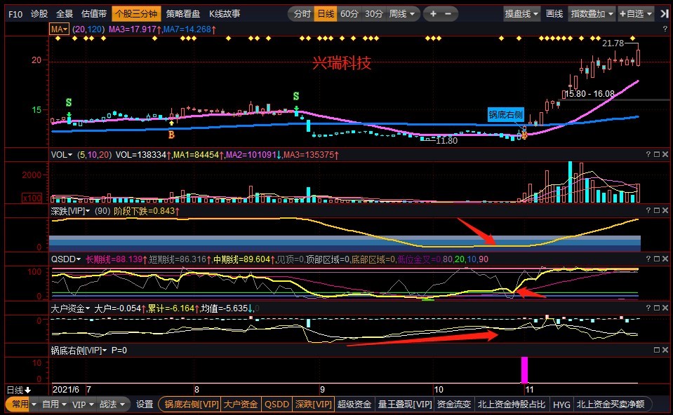 同日触发锅底右侧的兴瑞科技(18.25,-2.41%,13.5)也类似,深跌[VIP]指标进入超跌区间、QSDD短期线上穿中长期线、大户资金呈持续流入,其后出现了一波可观的波段行情: