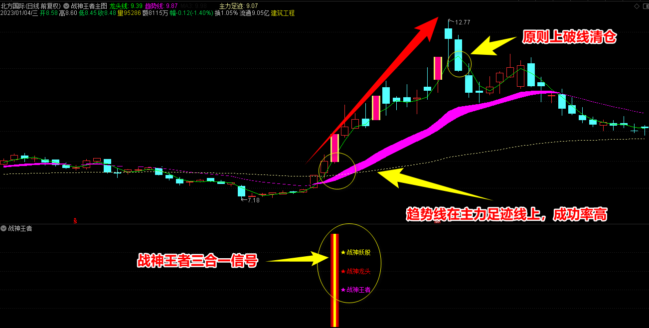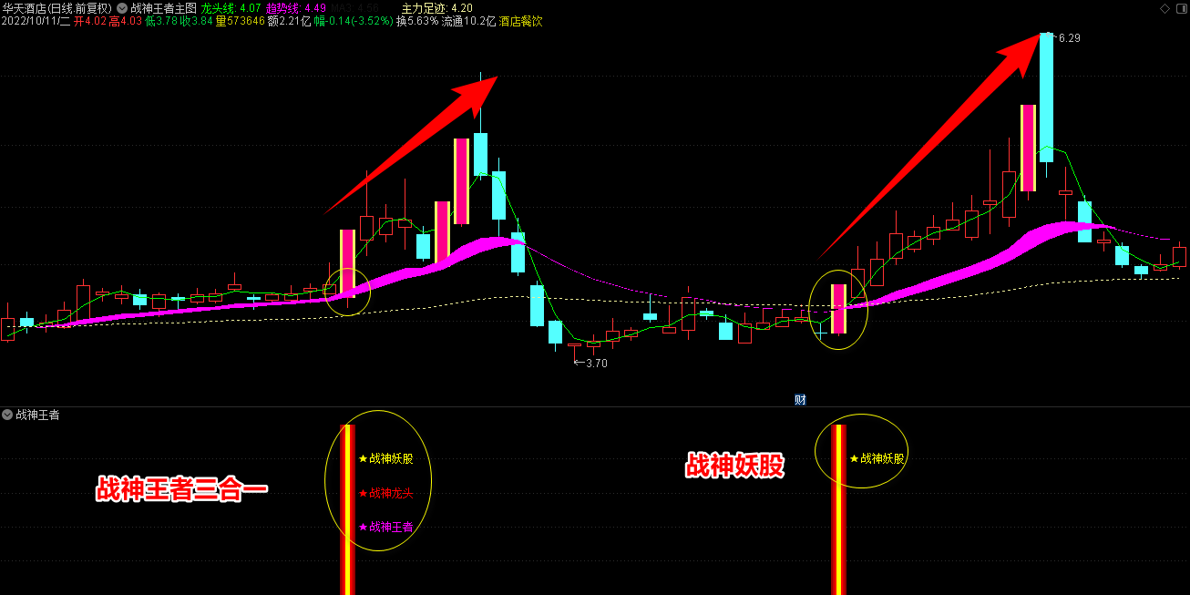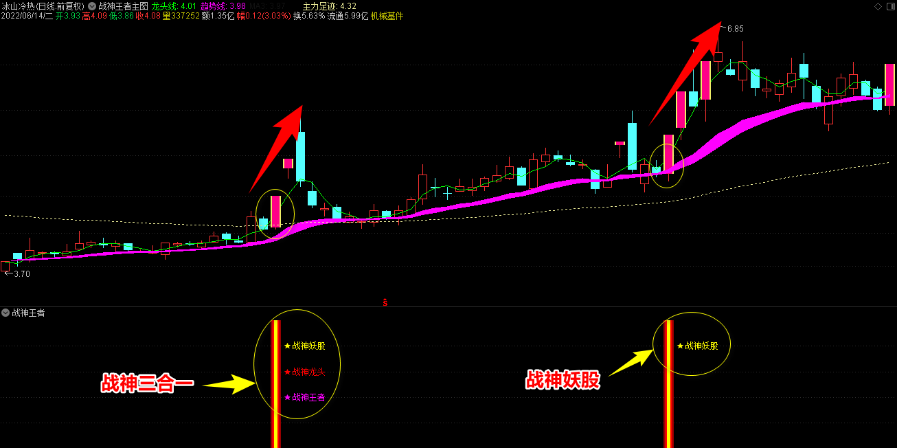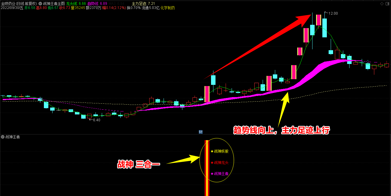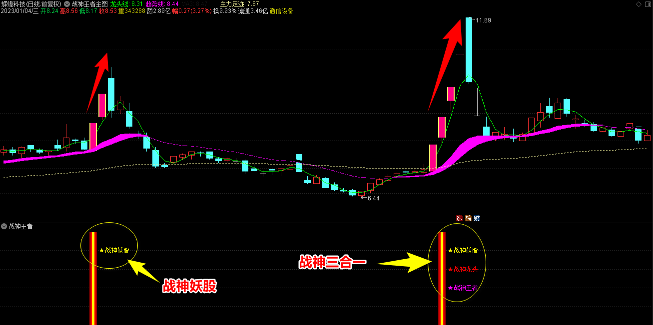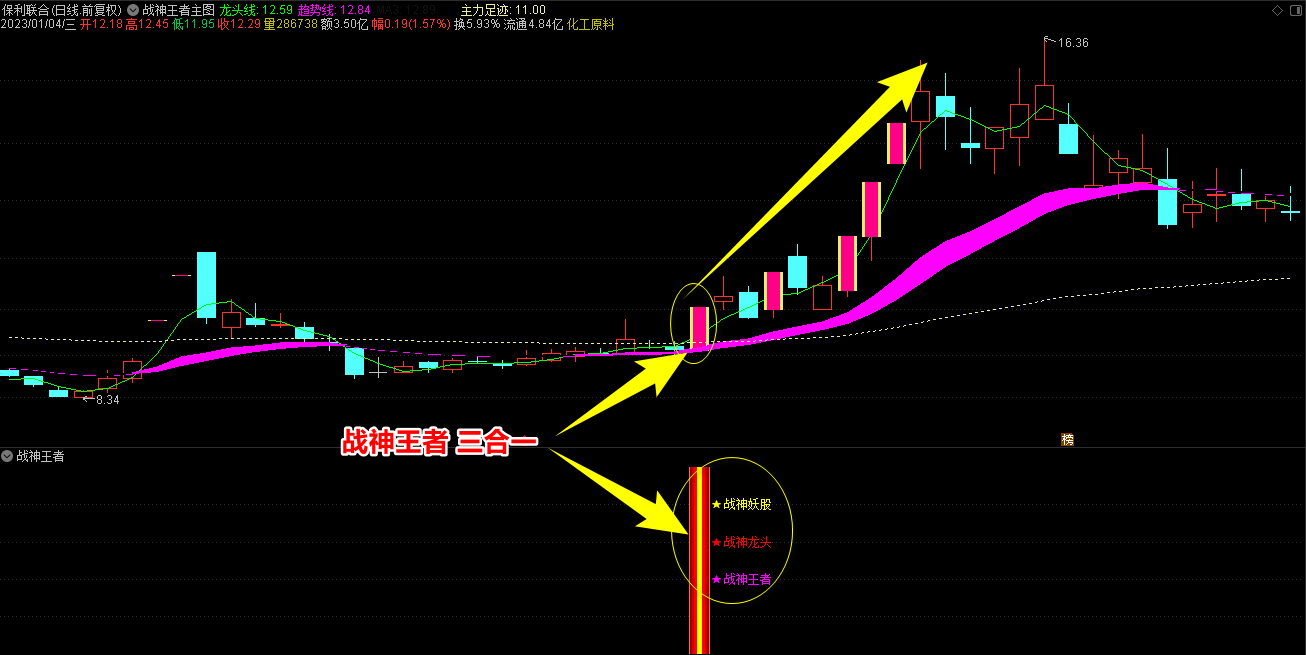 2.战神王者副图指标包含战神妖股、龙头、王者三合一信号和单个信号提示,三合一为共振最强信号;
