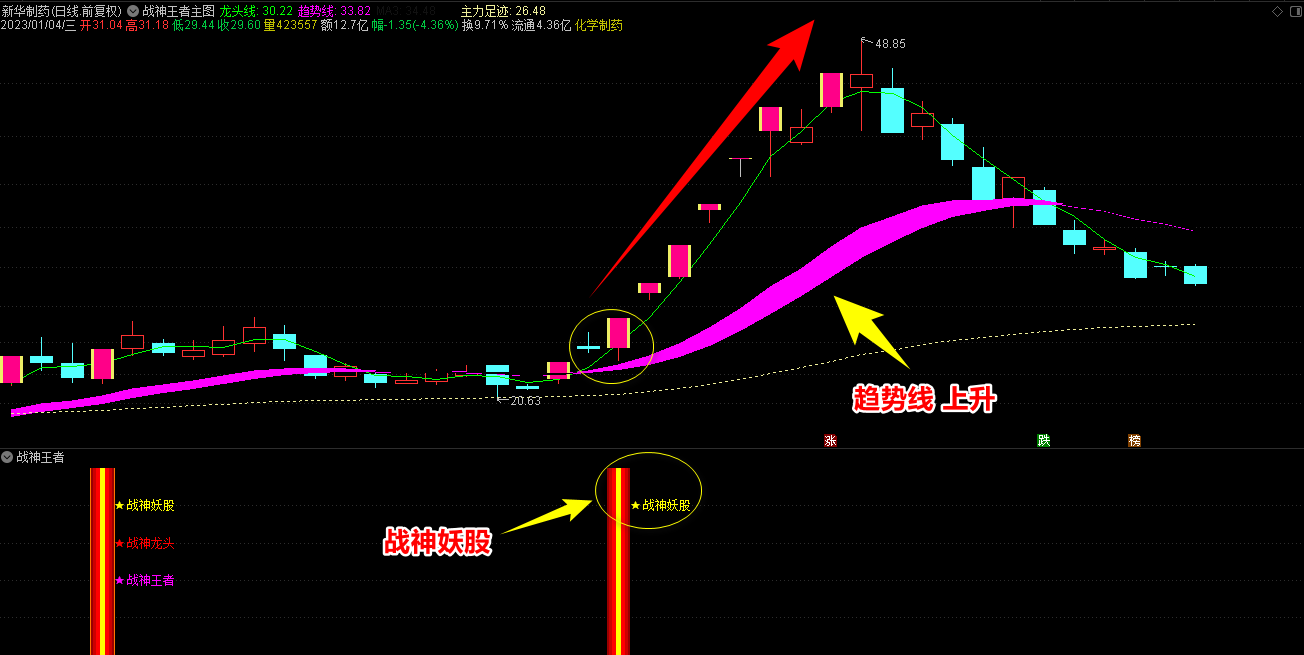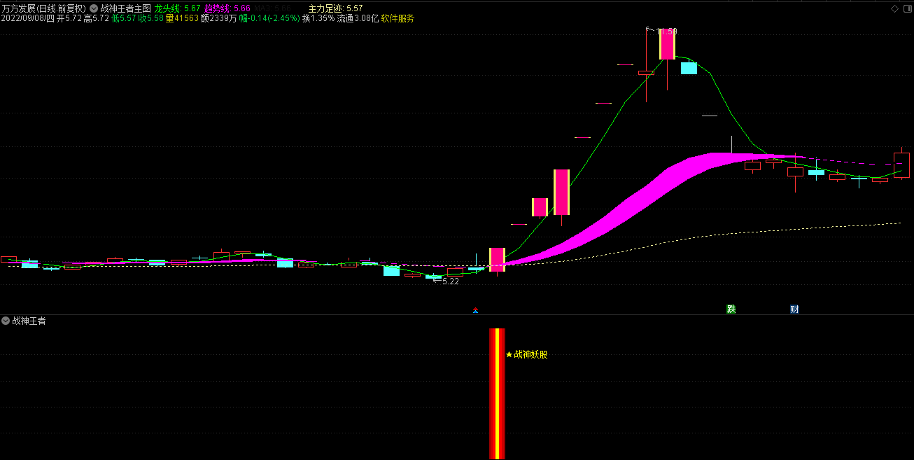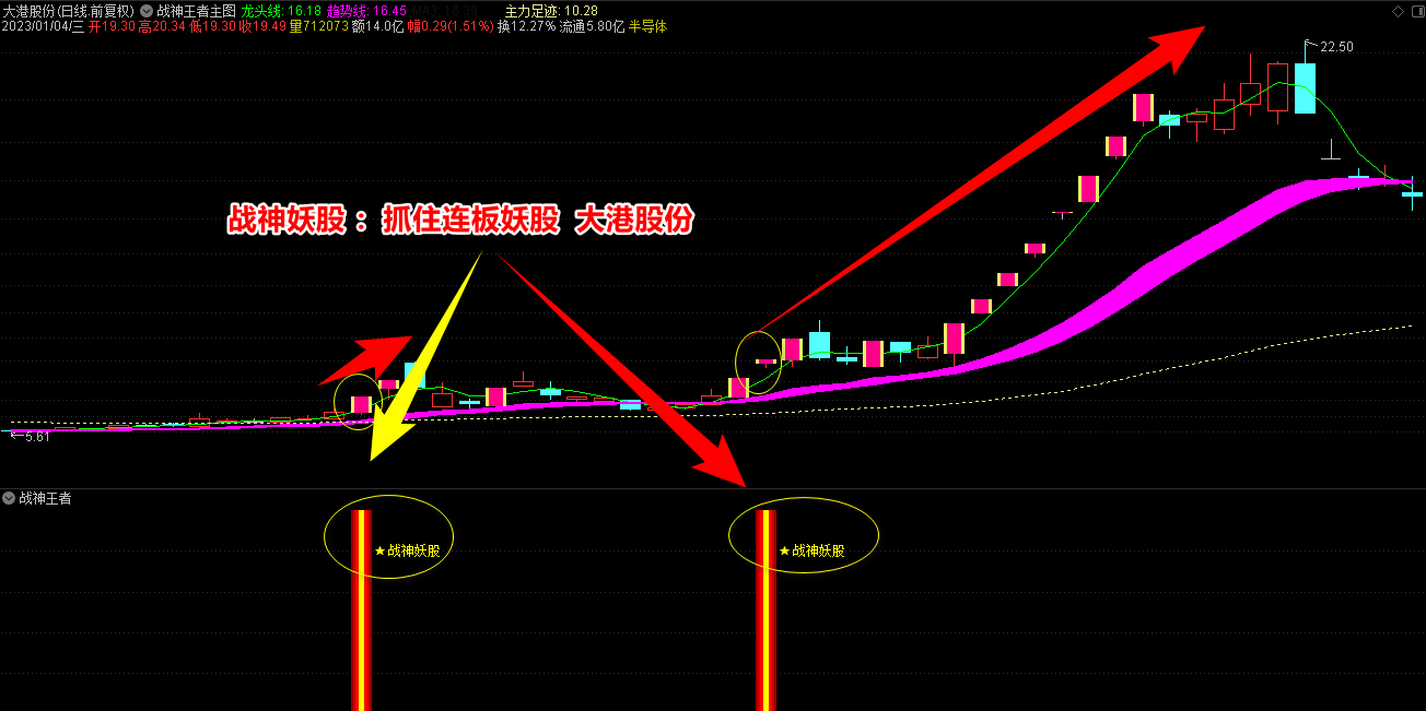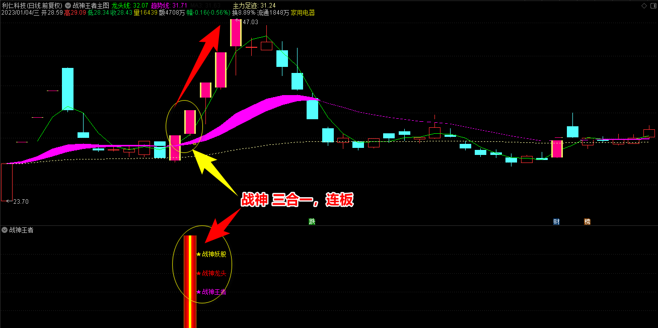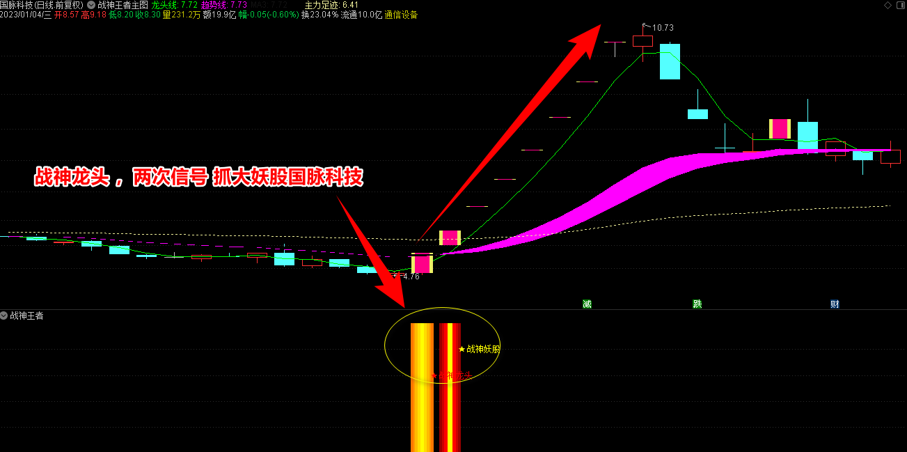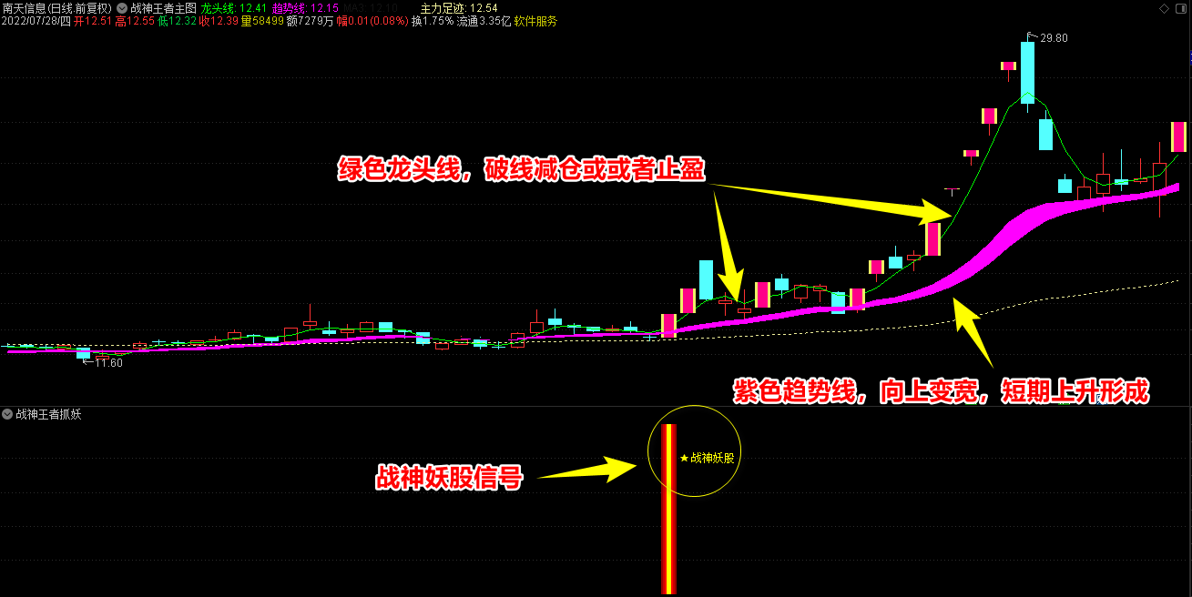 2.战神王者副图指标包含战神妖股、龙头、王者三合一信号和单个信号提示,三合一为共振最强信号;