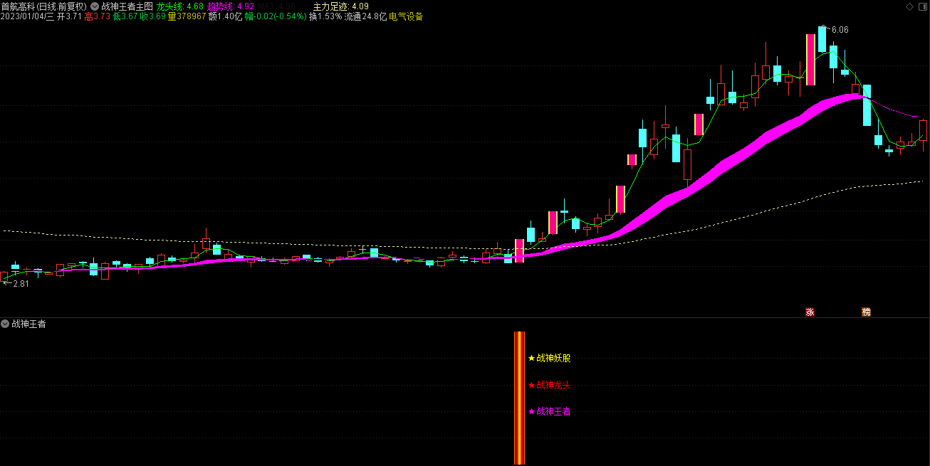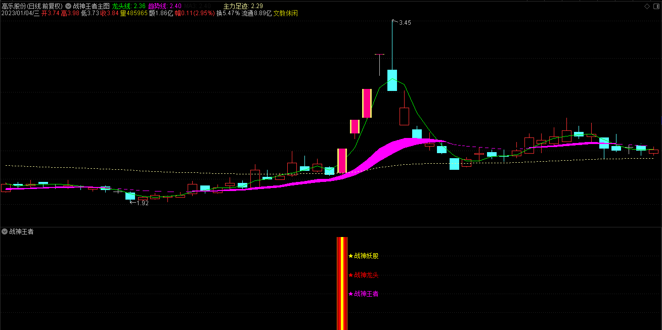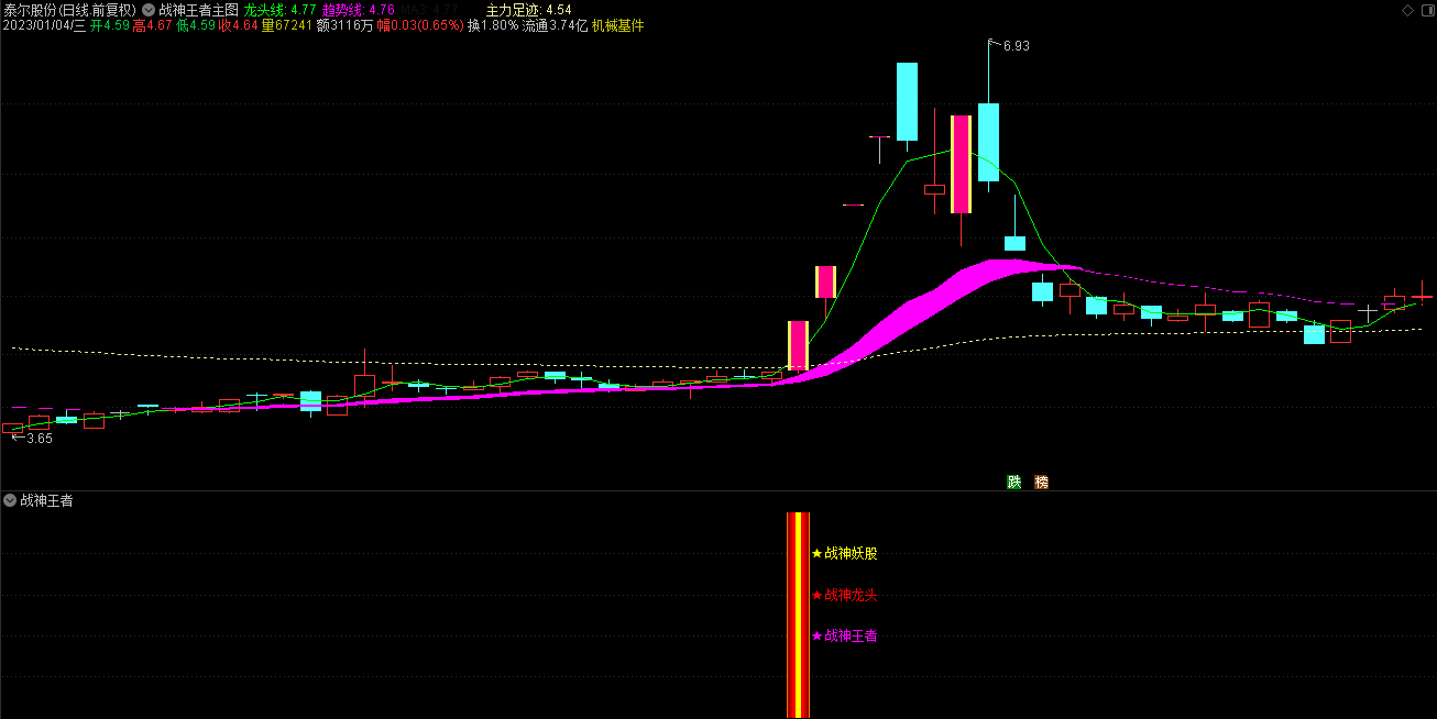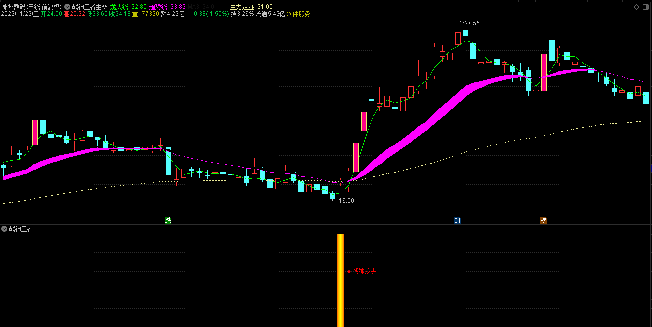 1.通达信2023会员版战神王者主图指标由龙头线、趋势线、主力足迹线没组成;