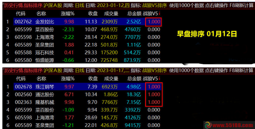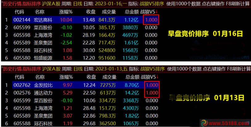 2.实战中使用战狼竞价排序V8系统排序后,优先选择排序值大于1的个股,一般选股前三个;