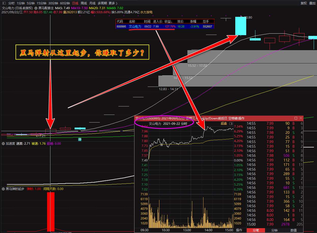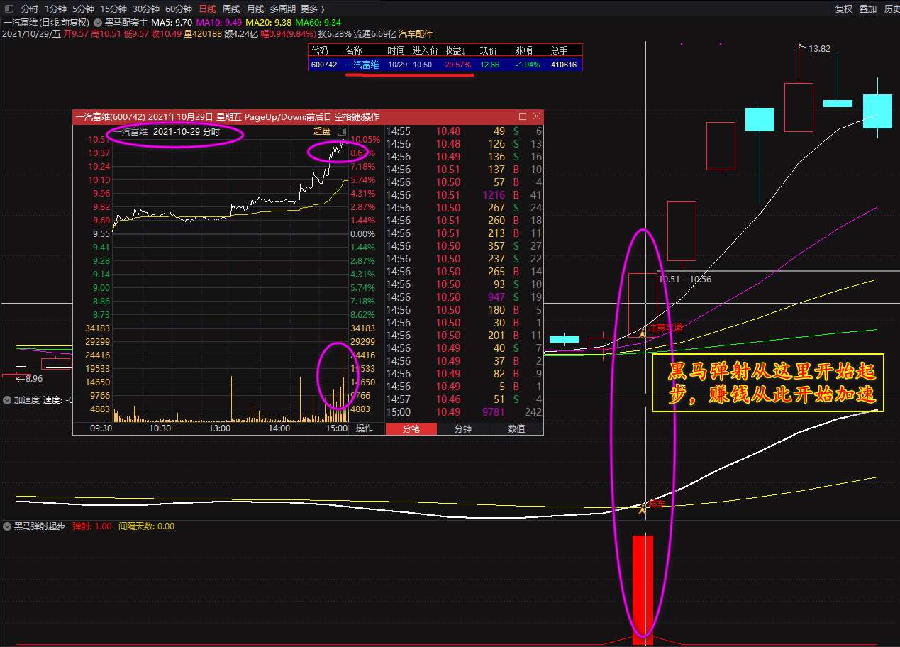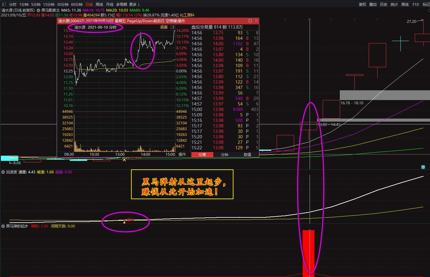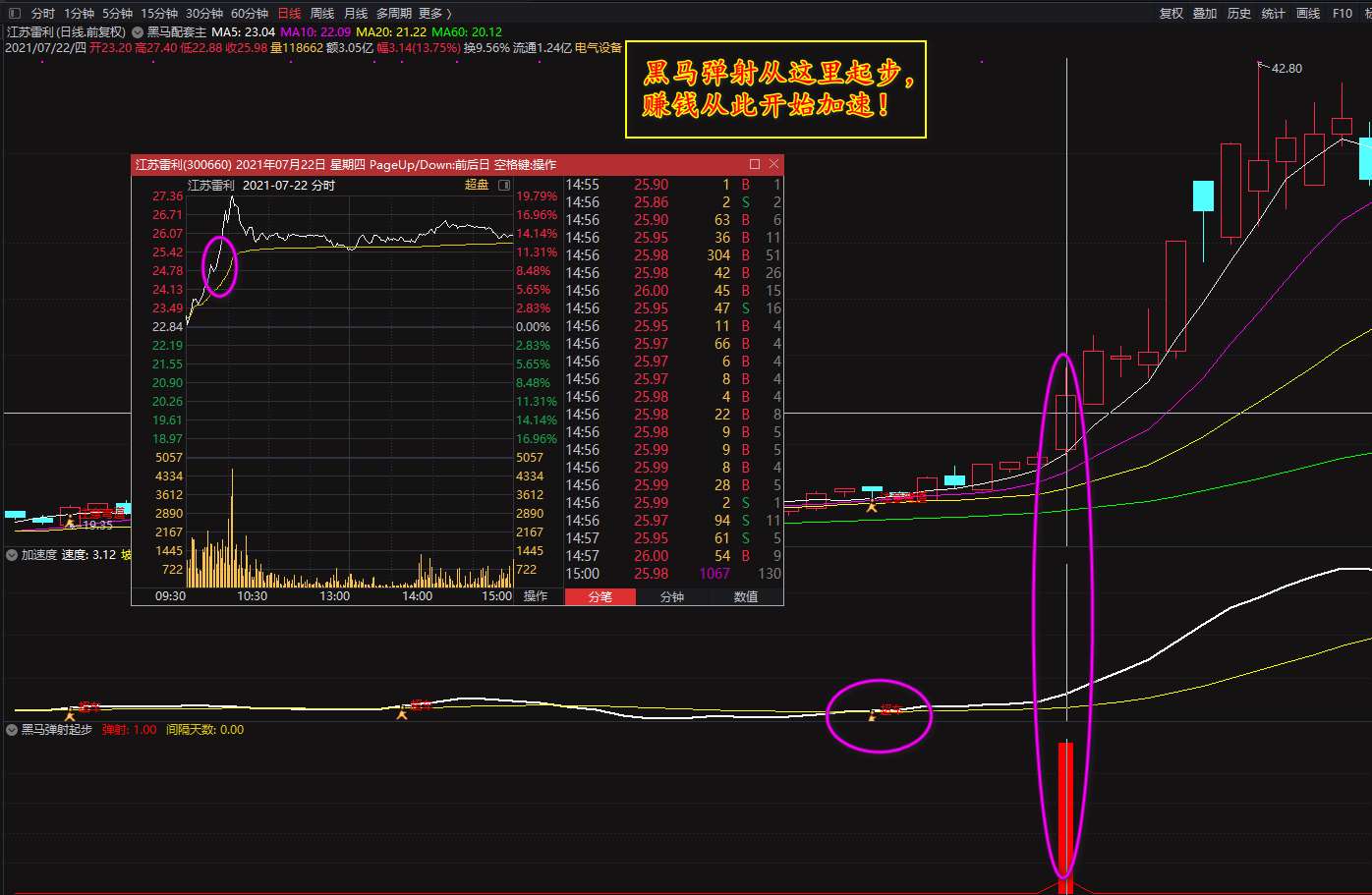 【黑马弹射起步】包括:选股公式1个+主图1个+副图2个。这是一量价结合的选股公式指标,由主图指标和副图加速度指标共同辅助使用,可做盘中预警和盘后分析使用,选股信号少,无未来信号、不漂移、不加密。