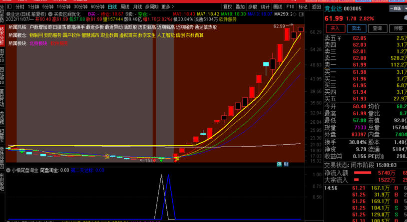 先设置尾盘预警,尾盘出票且信号一直不消失即可关注,次日冲高盈利及时离场,理论上止盈位为1%,具体情况根据盘中来决定。