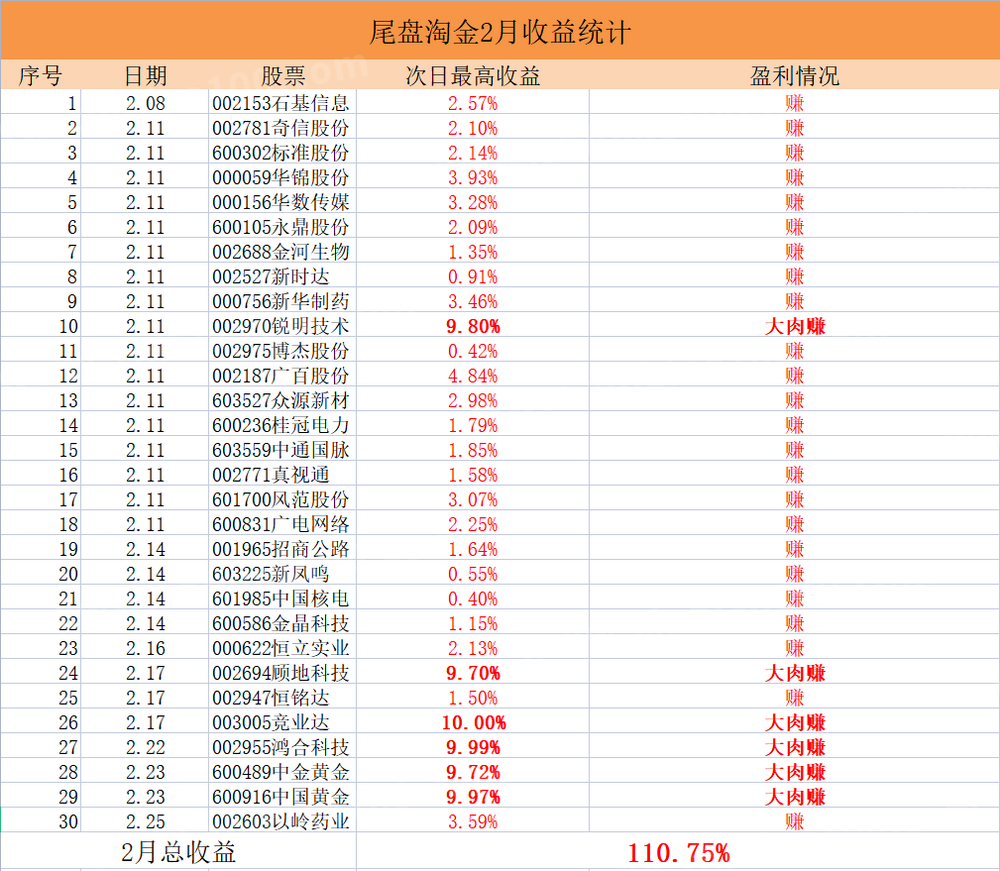 2、若一直到2.55-3.00都没有消失,即可关注!第二天冲高止盈,理论上止盈位为1%,实际情况根据盘中决定。