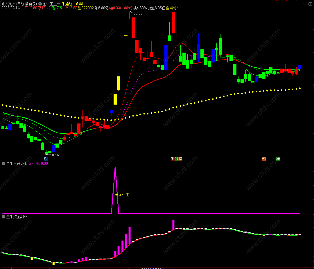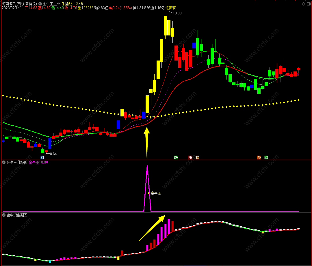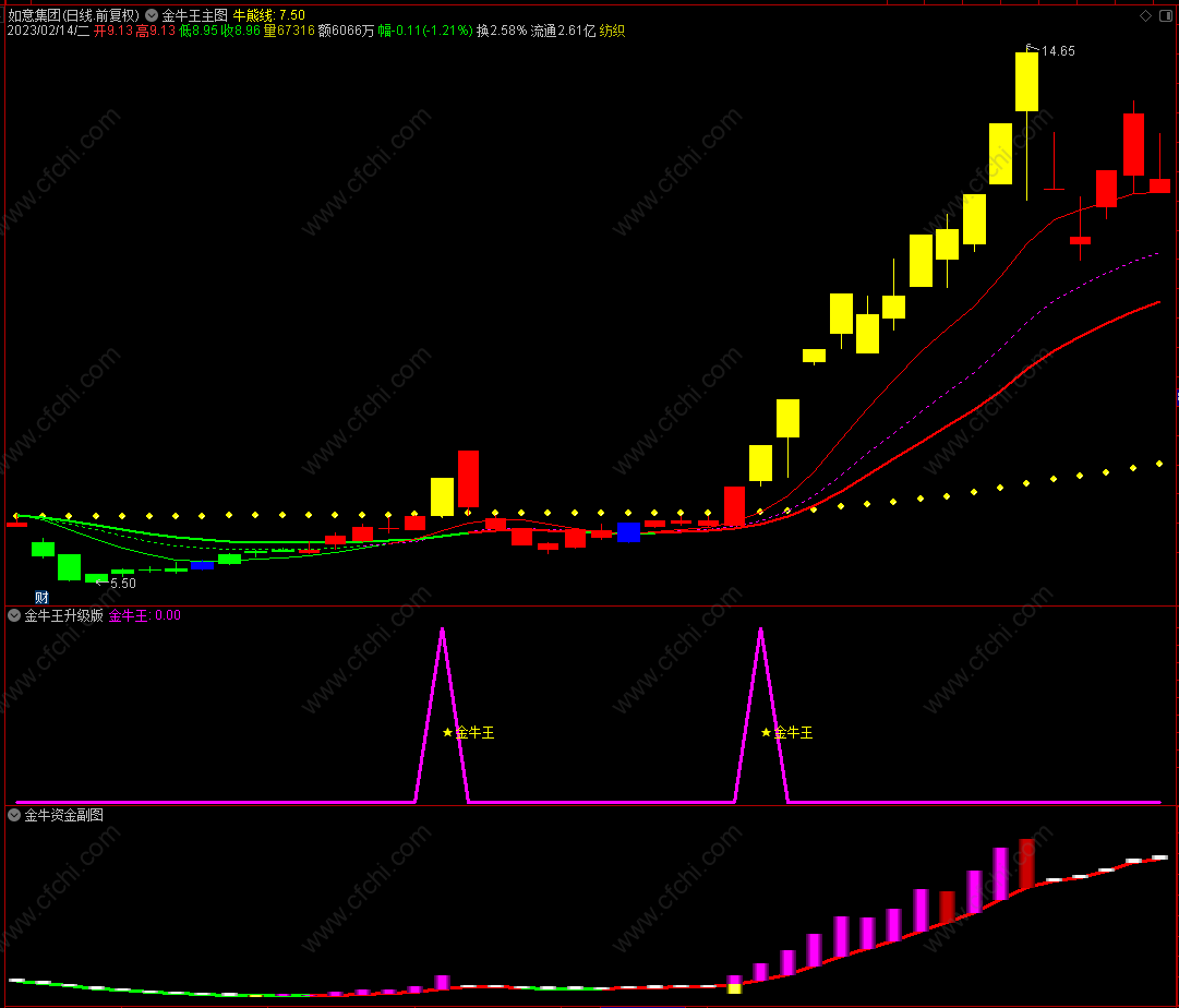 - 金牛决策金牛王主图指标有红绿波段趋势流、牛能线、红K线、绿K线、黄金K线组成;