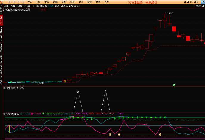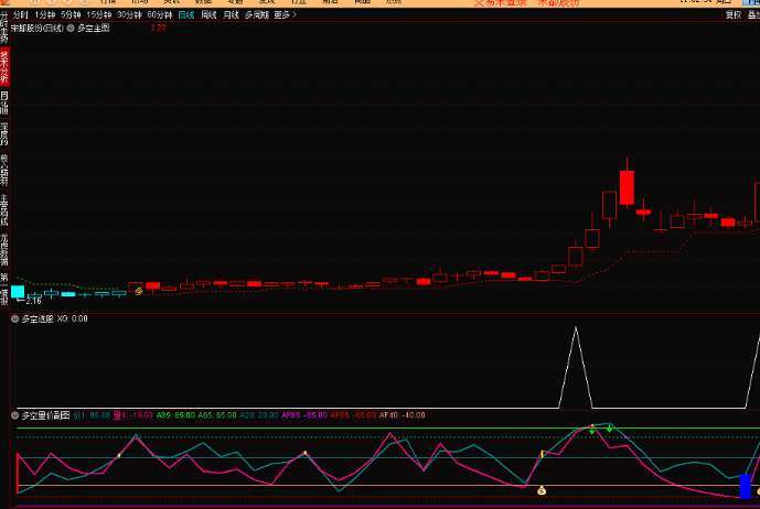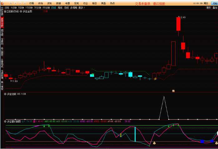 STICKLINE(价1<量1 AND 量1>65 AND 价1<-40,价1,量1,0.5,0),COLORCYAN;