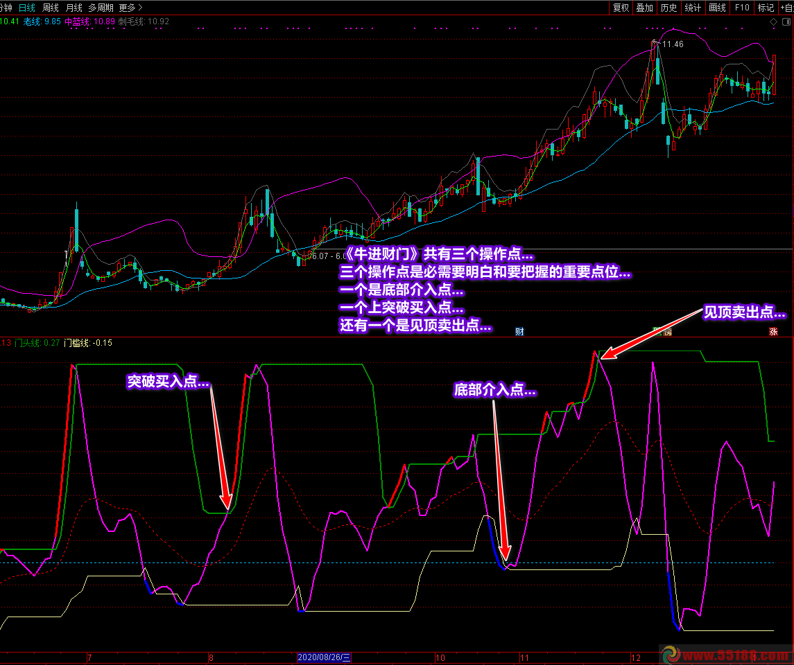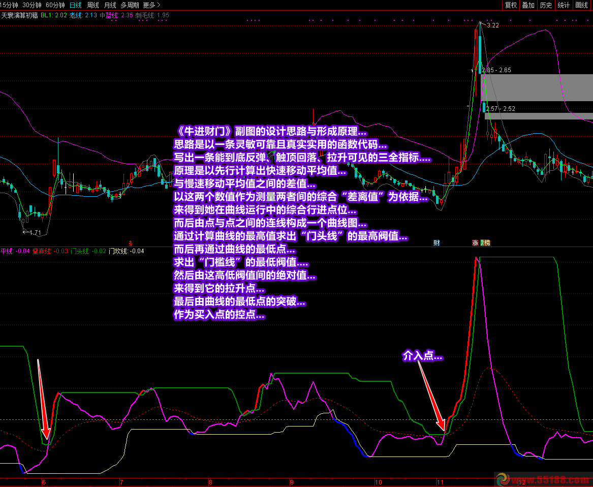 今天带来的是一个最近自己写的原创副图指标《牛进财门》。这个指标写在牛年,所以以牛名开头,说明牛年你牛气冲天,腰缠万贯。
