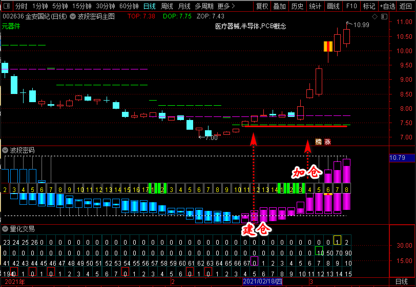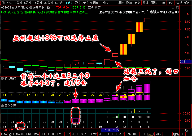 建仓后获利3%以上可以随意止盈,如果遇到【波段密码】副图紫柱封口并站稳三线,可以加仓不超过持仓的二分之一。