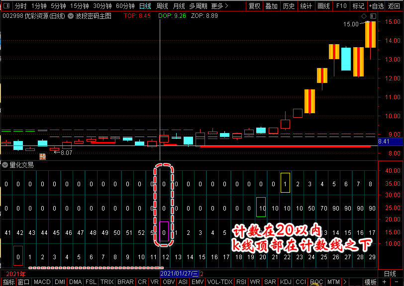这里整体的关键点在于第一个0的选择,根据我的实践经验,当第一个零出现时,【波段密码】副图的k线最高点必须在计数线之下,安全系数高。