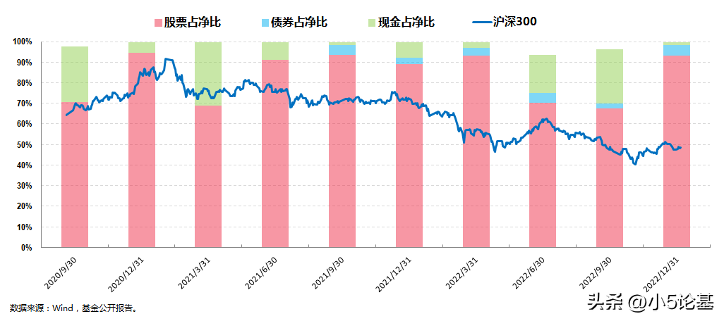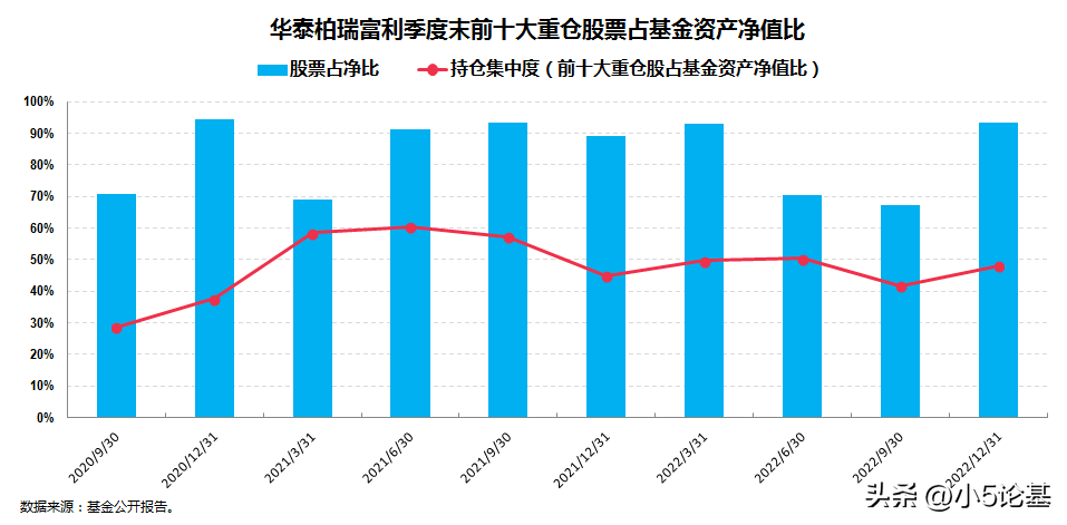 而在市场转暖的时候,组合又能适时的提升权益仓位。比较明显的比如2020年四季报,以及最新的2022年四季度,组合都提升到了接近95%的“满仓”仓位,这也使得组合在市场上涨阶段又能跟上市场的涨幅。