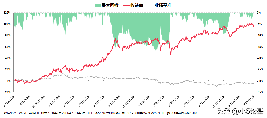 从收益率的角度,这只基金在董辰管理期间(2020年7月29日~2023年3月31日,下同)的总收益率为99.88%,折合年化收益率为29.56%。