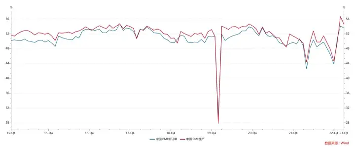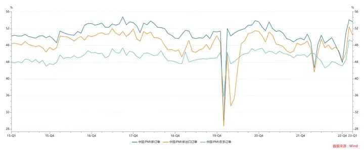 - 2023年1、2月,PMI触底回升,除了在手订单(绿色线)以外,其他指标都超过了50,也对应这两个月的消费复苏。