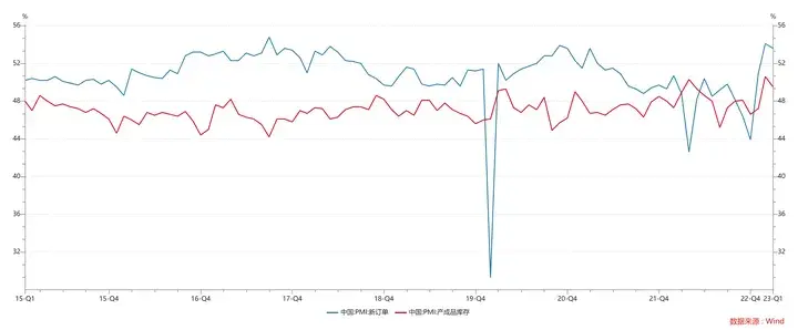 2023年1月,PMI新订单指数(蓝色)突增,但产成品库存(红色)还处在低位,表示需求回升,正在主动去库存,经济进入复苏期;到了2月,产成品库存也有所提高,超过了50,表示供给侧开始有补库存的意识,为经济复苏做好准备;到了3月,产品库库存下滑至50以下。