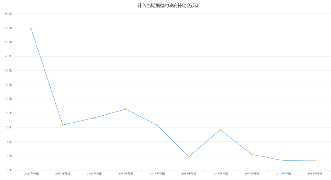 如上图所示,这几年都至少有20个亿的补贴,而2022年尤其高,居然拿到近55亿的补贴。