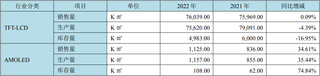 2022年TFT-LCD产量75620K㎡同比下降4.39%,销量76039K㎡,几乎和2021年持平。