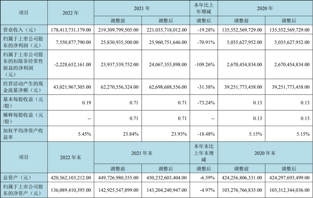 2022年营收1784亿,同比下降19.28%,净利润-17.37亿,又亏损了,归母净利润75.51亿,同比下降70.91%,扣非净利润-22.29亿,同比下降109.26%。