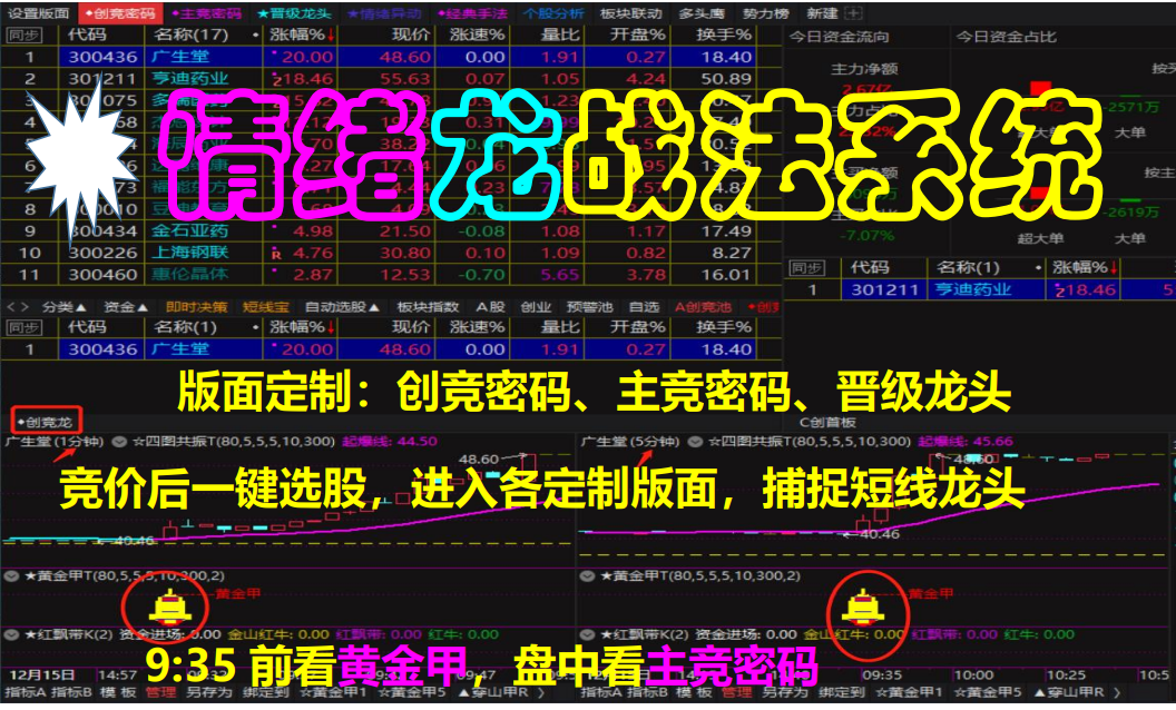 (即主竞密码)、晋级龙头、情绪异动等定制版面,并有与之对应的主副图指标、排序系统及预警选股公式,早盘竞价结束即9:25后,可一键自动选股!