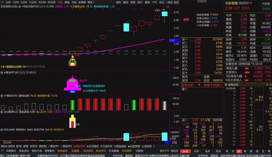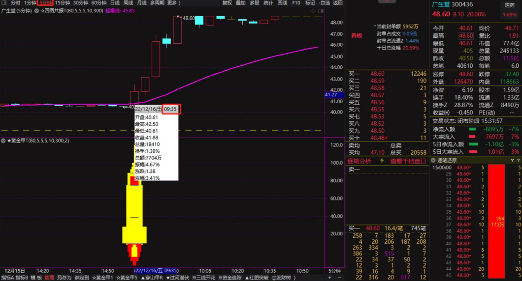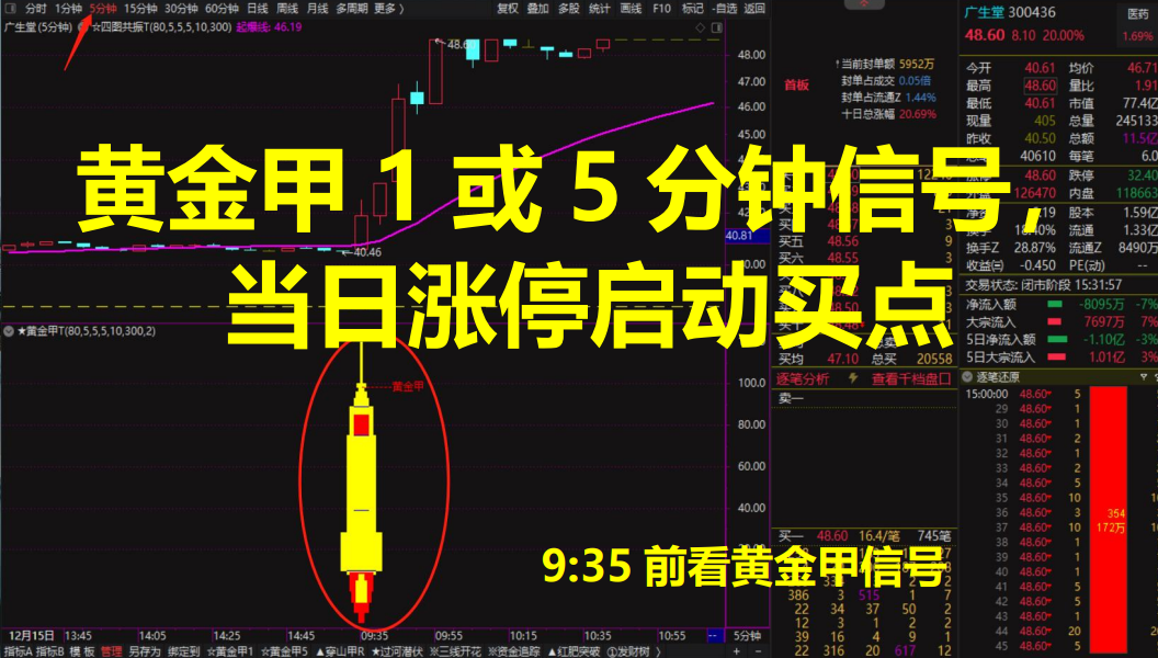 9:30~9:35看黄金甲、青丝甲和穿山甲分钟信号,9:35~15:00看穿山甲分钟信号,原则上9:35以后不看分钟信号了。此外,日线级别的穿山甲用于判断个股日线走向,适合做主板主升段,极易连板!