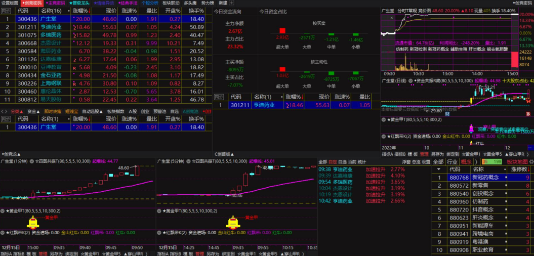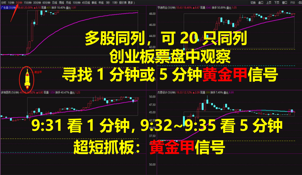 ②、也可在一键自动选股后,进入“创竞池”股票池或者创业板板块按涨幅排序,打开1分钟、5分钟周期共振主图,依据主图共振信号和黄金甲信号,9:35前即可锁定目标股,用于超短线抓板!!