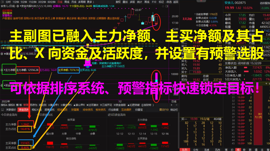 新增“定向资金”条件预警指标,预警范围为“预警池”;同时新增“净额博弈”定制版面,并删除了“多头鹰”版面;新增“资金流”分时主图!
