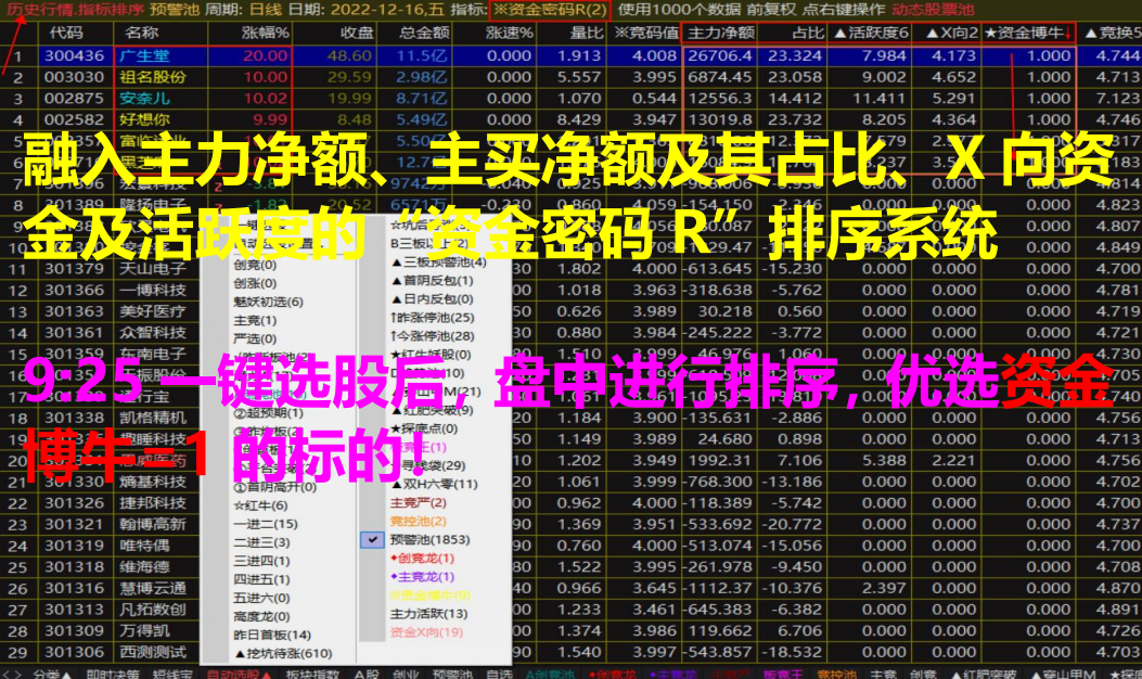 ③、情绪龙头战法:自动选股后,在定制版面股票池里,依据“资金密码R”排序系统进行降序排序,“资金博牛”=1为佳,并结合个股K线所处