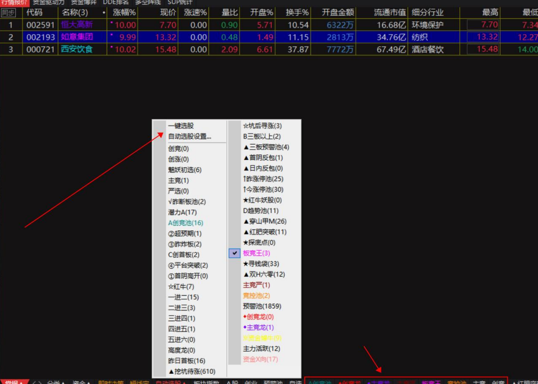 ①、可在9:25一键自动选股,分别进入“创竞龙”、“主竞龙”、“主竞严”、“板竞王”、“竞控池”、“主竞”股票池,用于早盘竞价;