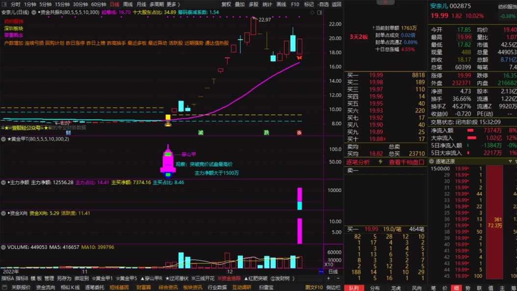 主、副图:进入个股K线图,选择“资金追踪”指标模板,配有“资金共振R”主图及“黄金甲T”、“主力净额”、“资金X向”三副图,当副图粉色