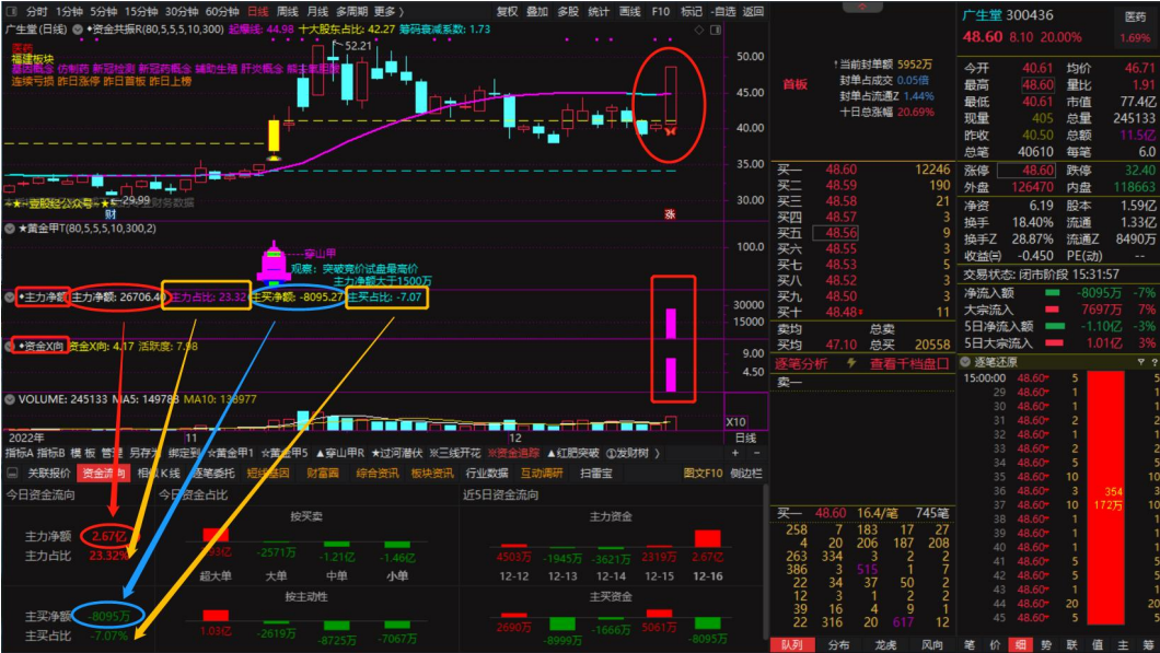 ④、一般操作创业板票,以黄金甲信号为主,青丝甲次之,选G时间控制在9:30~9:35,出现信号时,也要看看左下侧资金流向里面的主力净额大小及其占比,一般要求主力净额大于1500万且占比大于8%,如主力净额为负值时切勿买进!