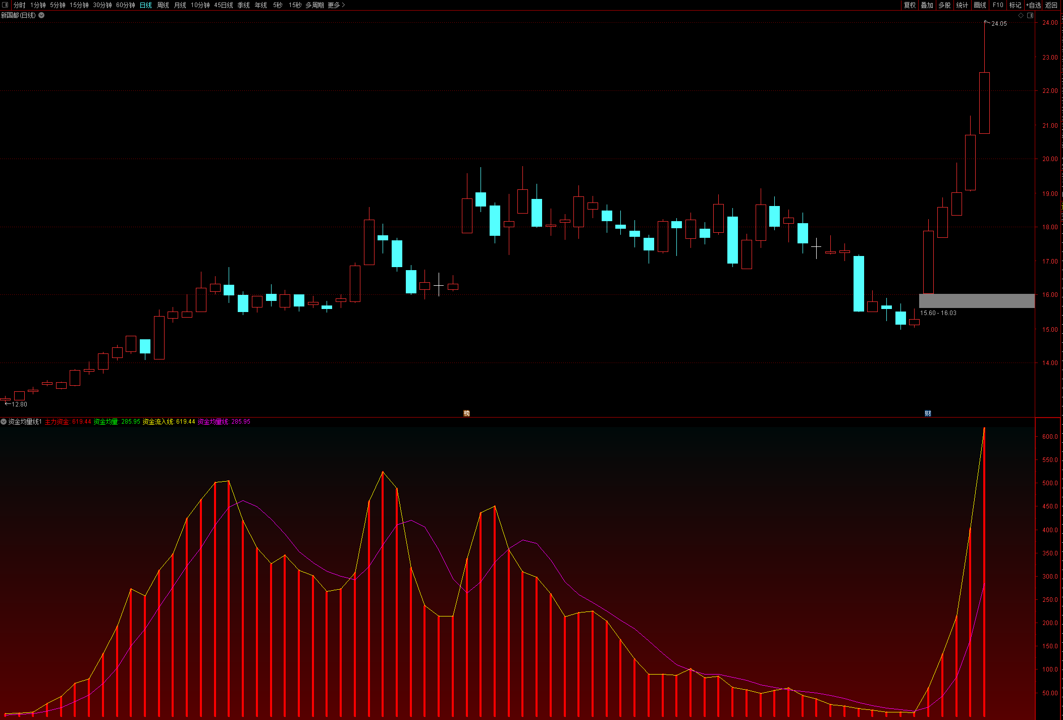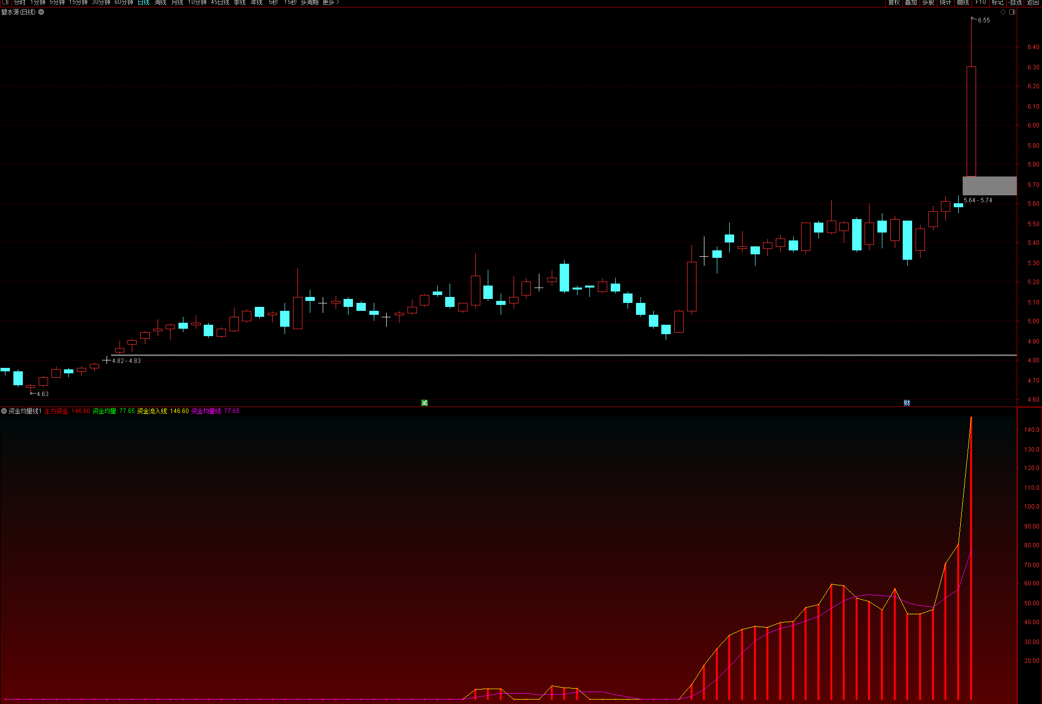 4. 资金均量线可以找到市场的关键节点,如当资金均量线向上突破K线图时,表明市场看涨情绪强烈,股价上涨的机会相对较大。