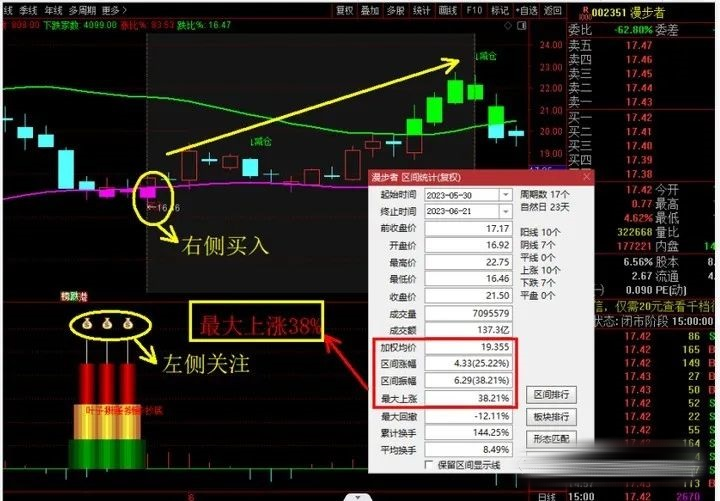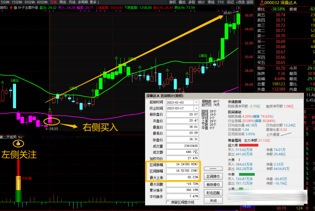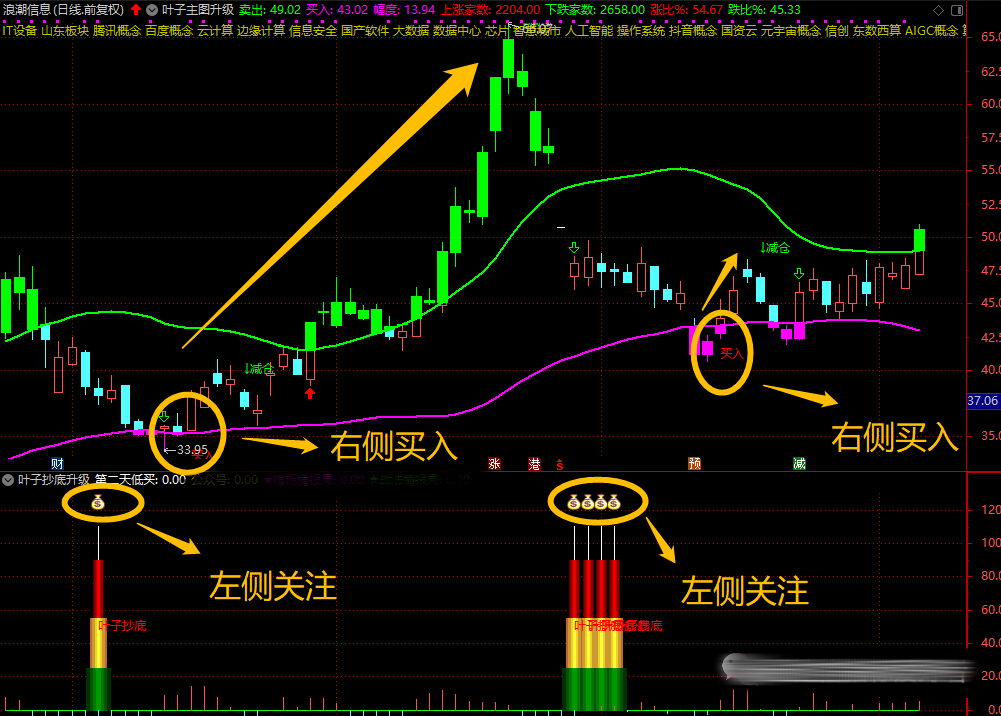 4、有的用户可以把叶子抄底当做左侧关注信号,当主图出现买入信号再作为右侧买入信号,这样会大大减少中间持股的时间,右侧买入拉升的概率会高。