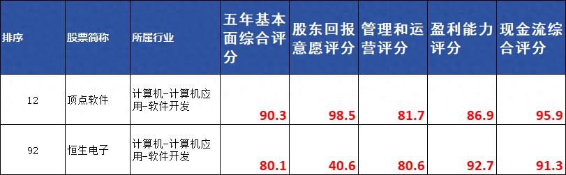 下面是顶点软件和恒生电子的评分对比:恒生电子和顶点软件差在了股东回报意愿这一项上,顶点软件近五年的平均股利支付率为61.3%,得分98.5分,而恒生电子只分了20.3%,得分仅有40.6分。我以前做过一期恒生电子的视频,感兴趣的朋友可以去主页翻翻,里面提到恒生电子也是一个不差钱的主,非常的赚钱,之所以不把手里的钱分出来,是因为这家公司喜欢到处投资,近几年的投资平均收益率在10%左右。两者的区别就是,一个是把手里的钱分给大家伙,让大家自行处理;另一个是喜欢把钱攥在自己手里,帮股东们去做投资。