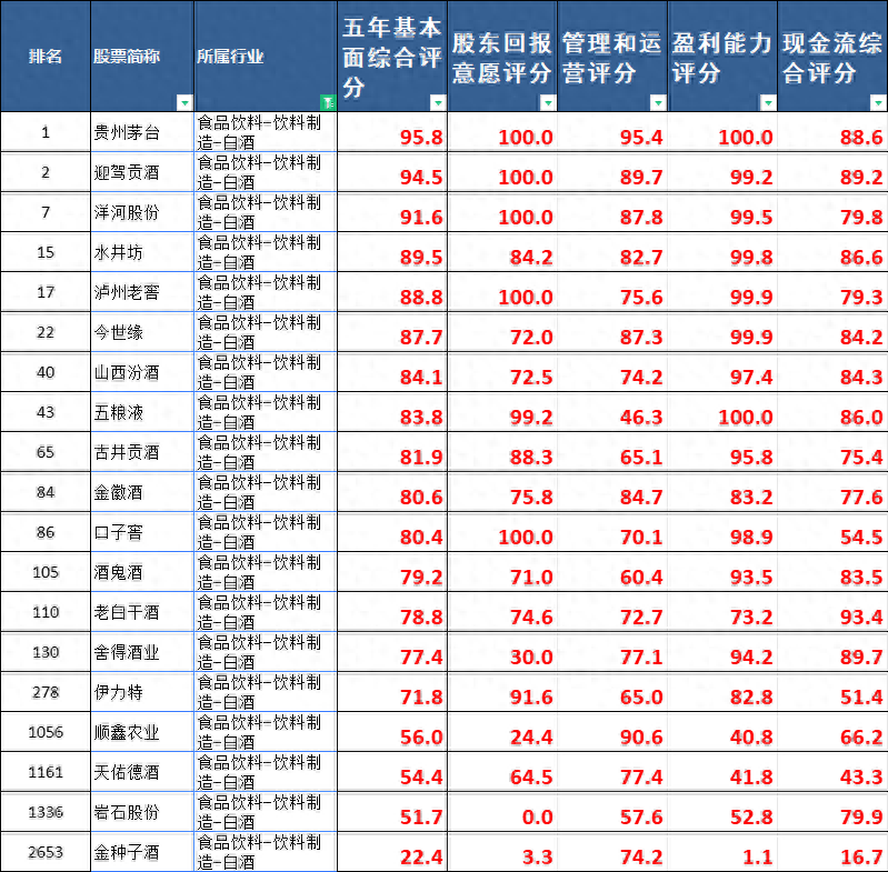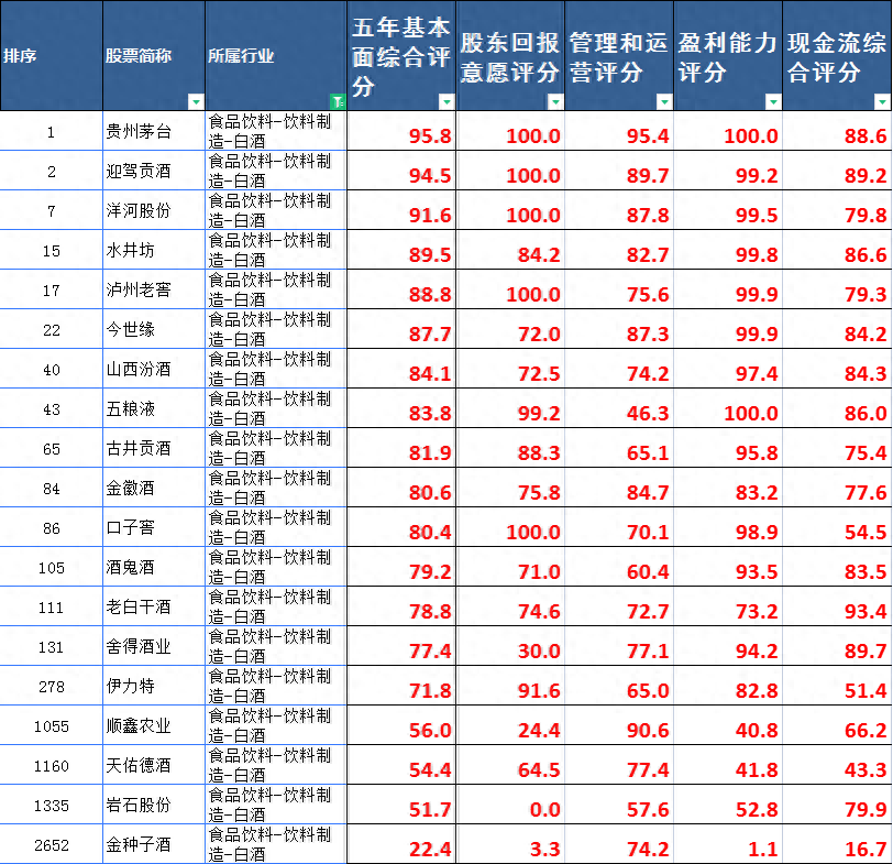 A股所有白酒公司评分及排名: